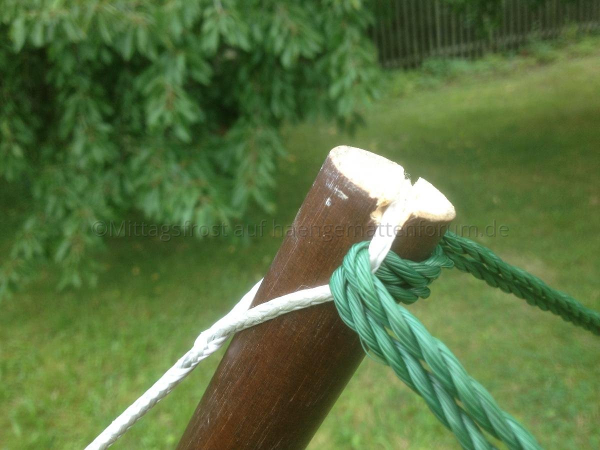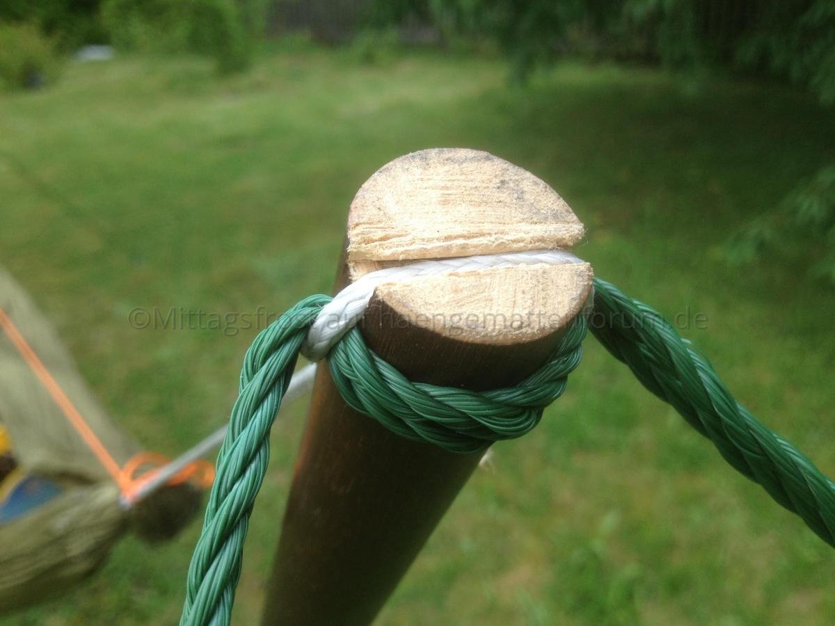 Mit 99 britischen Pfund ist das Teil aber nicht übermäßig billig. Kann man sowas selber bauen? Hm, am besten, ich probier's mal aus. Im Schuppen standen noch zwei hölzerne Gardinenstangen rum, Durchmesser 2-3 cm, Länge etwa Mannhoch. Müsste reichen. Strick und 4 stabile Heringe lagen auch noch rum. Auf geht's. Mit der Säge vom Taschenmesser habe ich eine kleine Vertiefung in den Stangenkopf gesägt, damit mir die Aufhängung der Hängematte nicht rausrutscht. So, das könnte funktionieren.