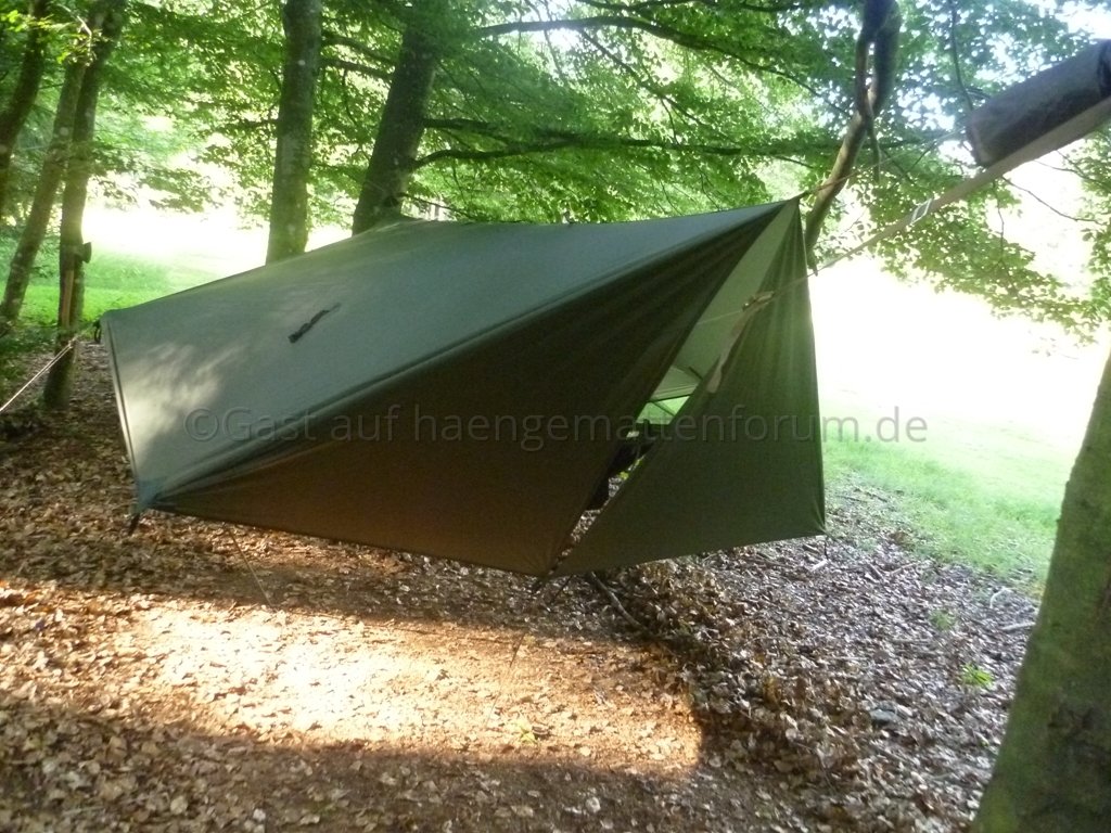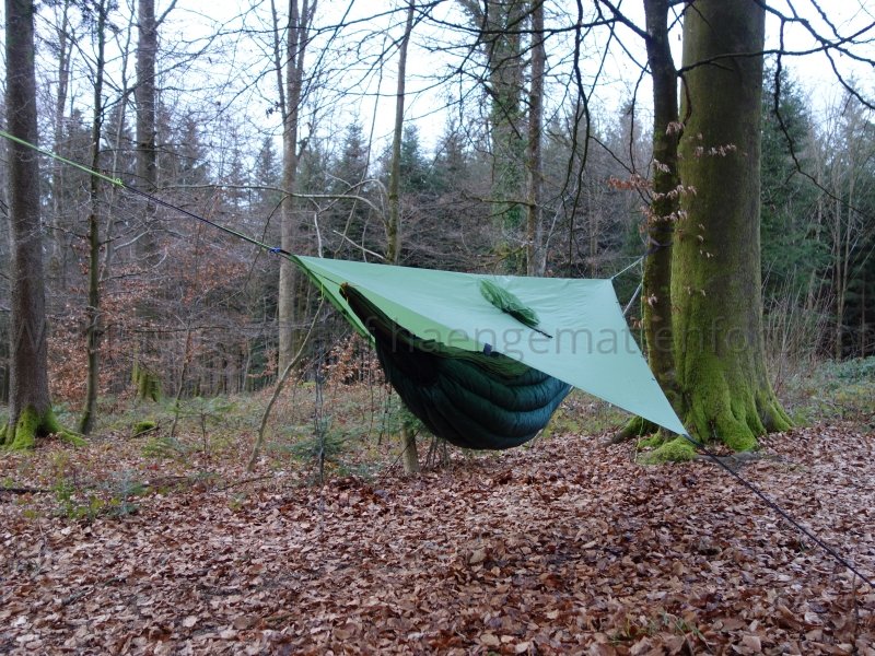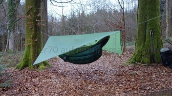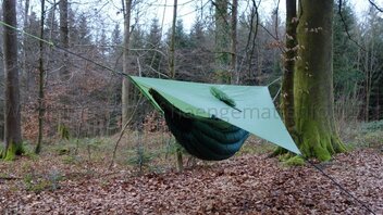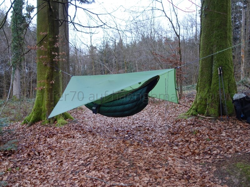 Ich könnte mir dieses Setup mit meiner ENO Double Nest bei positiver Wetter-Tendenz gut vorstellen, habe auch schon in diesem Setup draussen übernachtet, aber noch nie bei Regen. Bei schlechtem Wetterbericht würde ich mich so aber wohl eher ungenügend geschützt fühlen.