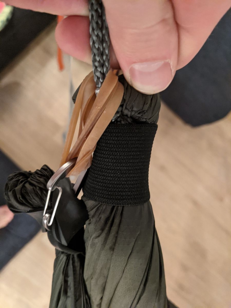 Habe ein Problem in der Kombination wooki XL und Eldorado single layer 40D. Irgendwie kriege ich es nicht hin den wooki aufzuhängen ohne dass das Gummiband den Geist aufgibt. Habe es jetzt behelfsmäßig mit 2 dicken Haushaltsgummis verlängert (s. Bilder) aber eigentlich sollte es doch ohne gehen? Bin für Hinweise auf den Fehler den ich mache dankbar