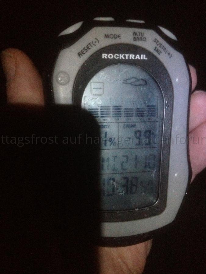 Gegen 3 Uhr musste ich mal auf Toilette. Also Reißverschluß des Mückennetzes auf, um aussteigen zu können. Aber halt, was ist denn das? Er ließ sich nur bis zur Schulter öffnen. Licht an. Da sah ich die Bescherung. Mein Atem war am Reißverschluss kondensiert und hatte ihn auf etwa 5 cm Breite mit einer Eisschicht überzogen. Beim Auftauen durch Handauflegen wurden meine Finger unangenehm kalt. Brrr! Da werfen wir doch gleich mal einen Blick auf das am Gurtband der Aufhängung befestigte Thermometer.