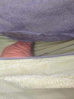 So, fertig. Schnell wieder rein in die Hängematte. Nach einer Weile wurde es wieder warm. Aber leider nur an der Oberseite. Der Rücken blieb kalt. Kontrolle, ob der Wooki richtig sitzt. Paßt. Es bleib trotzdem kalt. Irgendwann schlief ich dann doch wieder ein, aber der Schlaf wurde immer wieder durch Wachphasen unterbrochen. Gegen 5 hielt ich es nicht länger aus und flüchtete auf's Sofa im warmen Gartenhaus.
