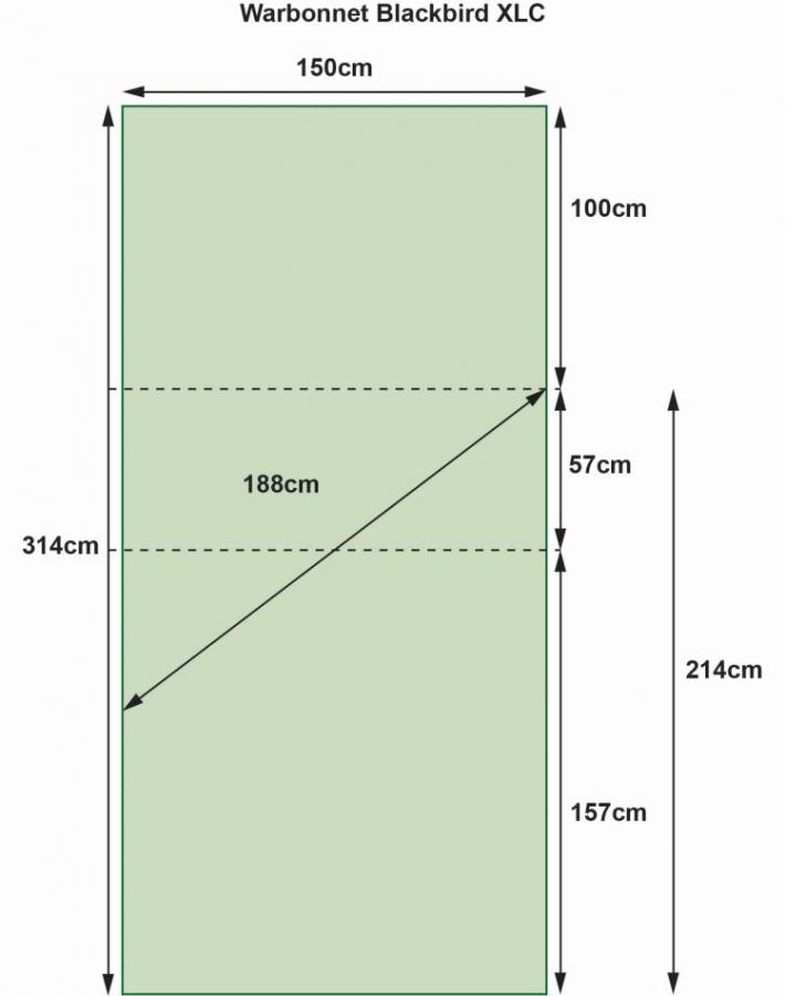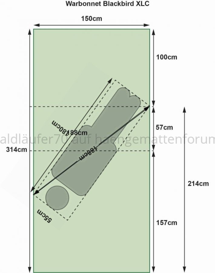 Nein, das habe ich ja versucht mit meinem Diagramm zu verdeutlichen. Soweit ich das durch "reverse engineering" feststellen konnte, hat Brandon alle Maße und Punkte für die jeweilige Hängemattengröße errechnet. Ich weiss (noch) nicht, welche Körpergröße er für die Standard Blackbird zu Grunde gelegt hat - aber für die XLC scheint ein 180cm großer Nutzer vorgesehen zu sein. Jedenfalls stimmen meine Messungen mit meinen Berechnungen ziemlich gut überein. Für den Nutzer habe ich diese Werte zu Grunde gelegt: