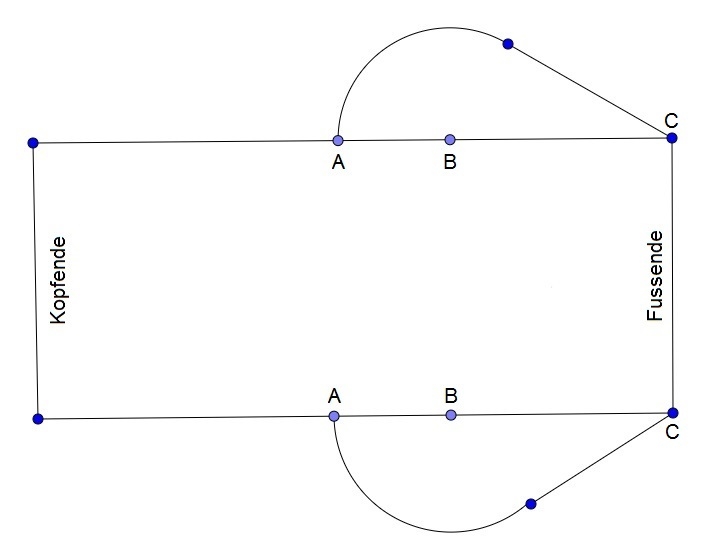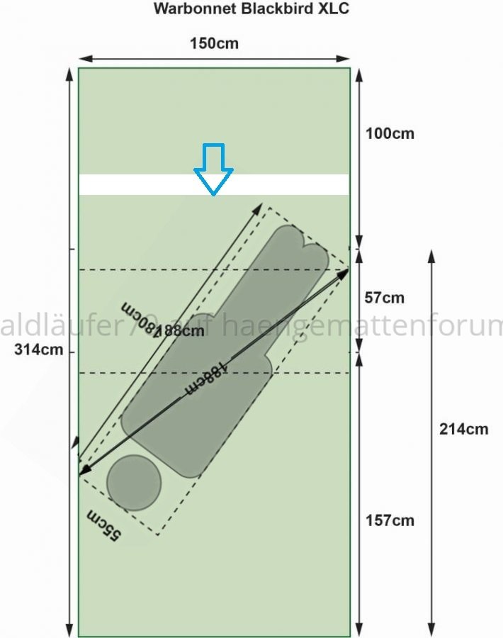 Eigentlich musst du zuerst entscheiden, wie lang deine Hängematte sein soll wenn du die Tunnelzüge genäht hast, und wie lang deine Ridgeline ist. Die WB Ridgeline ist sehr lang im Verhältnis zur Hängematte - aber das musst du ja nicht kopieren. Dann errechnest du deine "Diagonallänge" - und damit kannst du ziemlich genau bestimmen wo deine Füße zu liegen kommen, und wo die Spitze der Footbox sein sollte. Daraus ergibt sich wiederum der Winkel den eine Footbox im Warbonnet-Stil haben sollte. Was aber eigentlich nicht wichtig ist, wenn du die Spannung mit einem Seil herstellst.