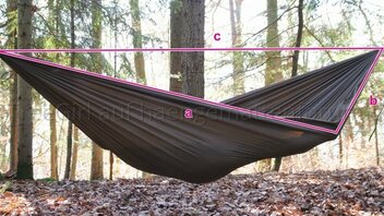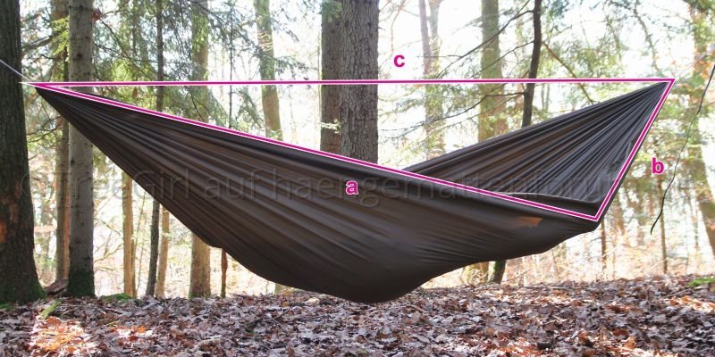 Auf diesem Bild sieht man, welche Form eine meiner Hängematten annimmt wenn ich darin liege. Meine Füße erzeugen die Spitze von einem Dreieck, das von der Ridgeline (c) und der Hängematten-Kante (a + b) gebildet wird. Würde ich ein Moskitonetz annähen wollen, hätte es auf der Fußseite diese Form. Auf der Kopfseite würde ich die Form ähnlich ermitteln. Aber wir wollen ja nur eine Footbox ohne Netz, die die Hängematte auch unbelastet in die belastete Form zieht.