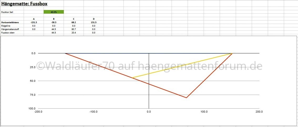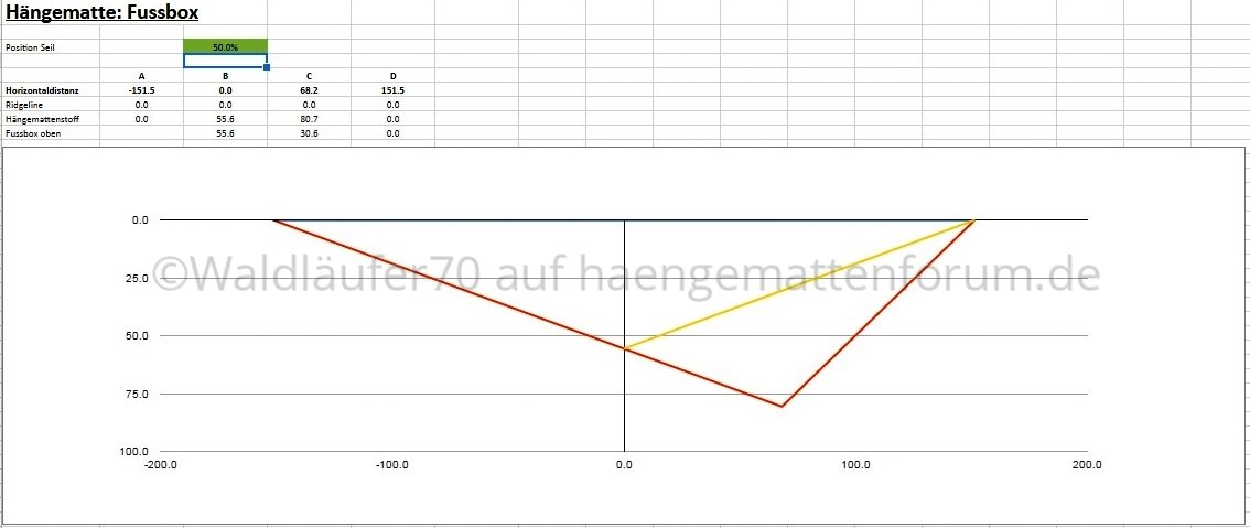 Wenn du eine Footbox nach dem Vorbild von Warbonnet konstruieren willst, ist deutlich mehr Planung notwendig. Damit die Footbox perfekt passt, solltest du die Hängemattenlänge (gemessen zwischen den Ansätzen der Ridgeline), die Ridgelinelänge und den Punkt kennen, an dem deine Füße liegen. Mit den Maßen kannst du jede beliebige Footbox errechnen. Ich habe versucht, dass noch einmal besser zu veranschaulichen.