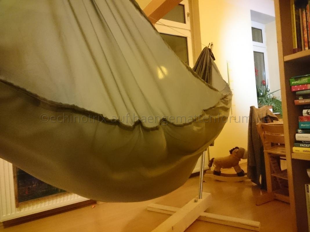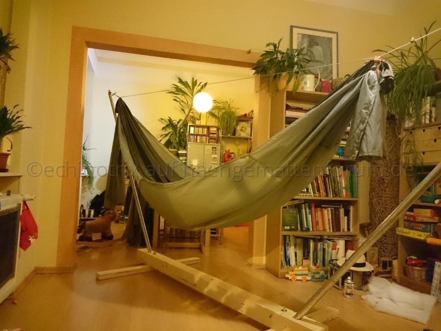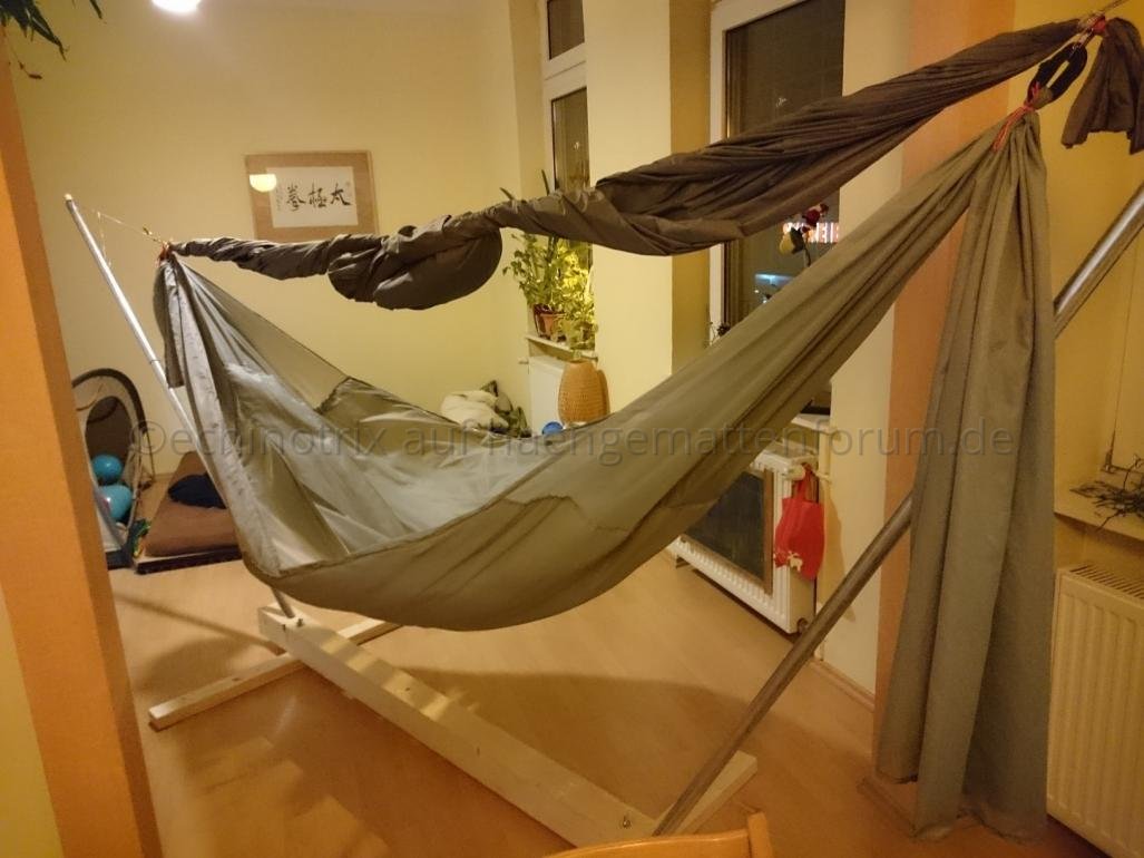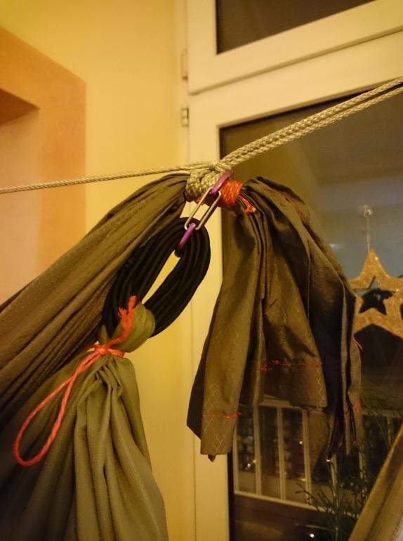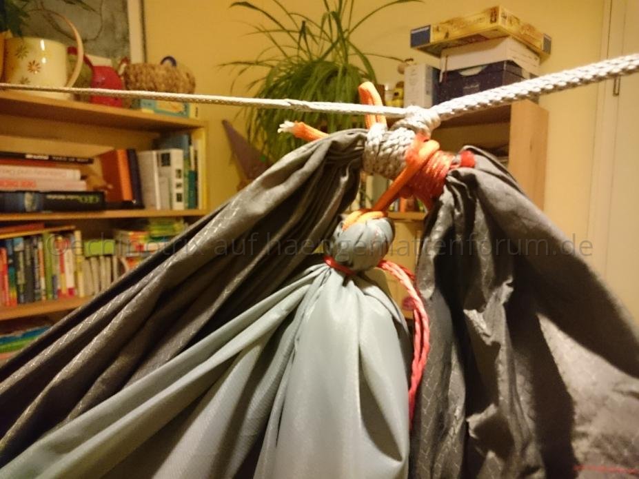 - die Enden gewhippt, am Kofende einfach an der HM festgebunden, am Fussende zusätzlich ein Gummiseilbündel und einen Karabiner eingebaut