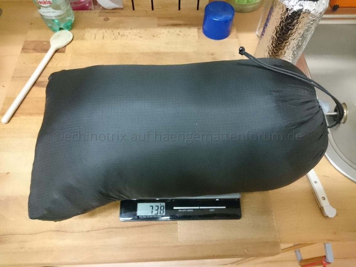 - Das Gewicht ist in Ordnung (738 g), das Packmaß entspricht in etwa dem meines Burrow 20 (der Packsack auf dem Bild war vom Burrow)