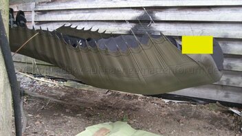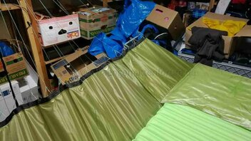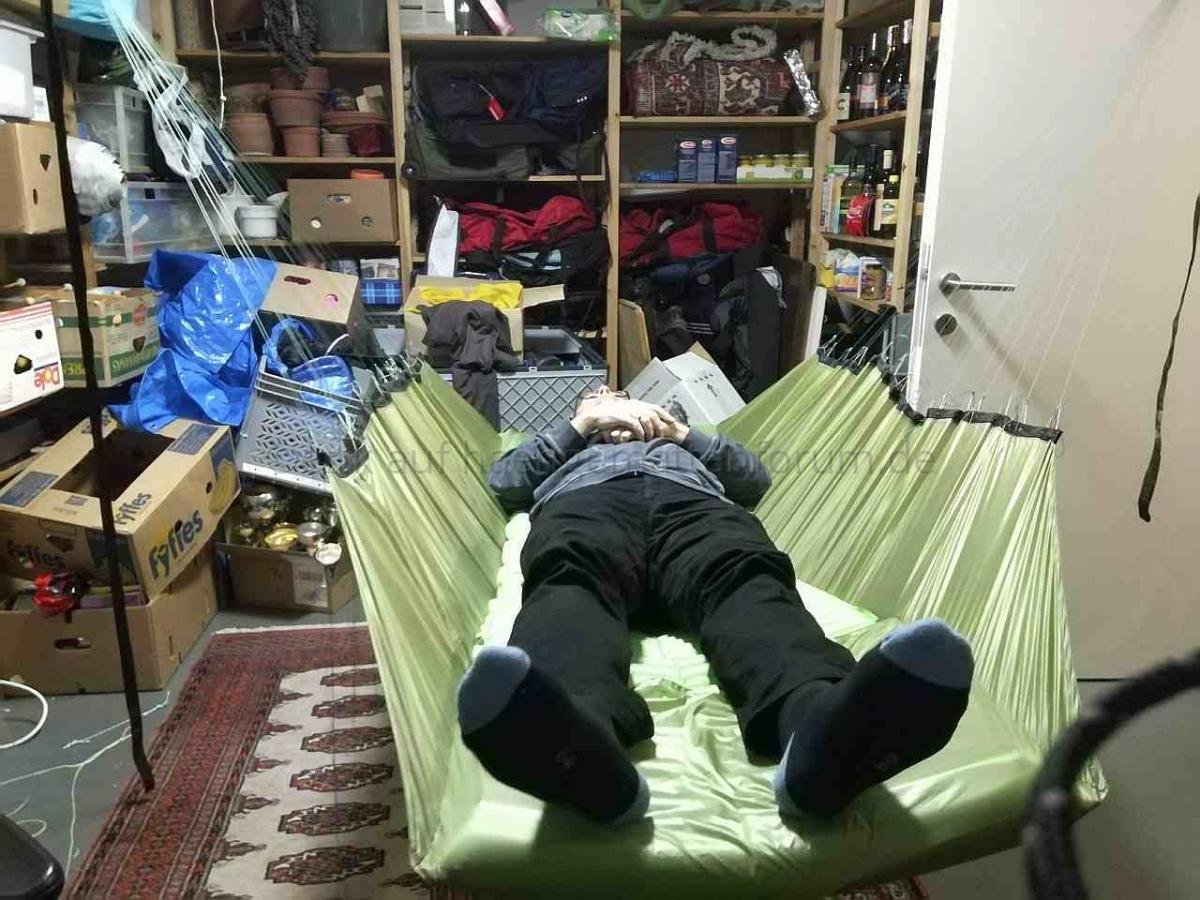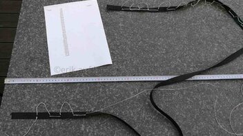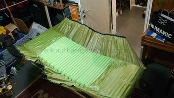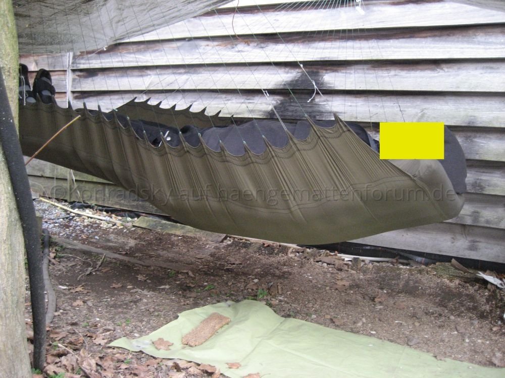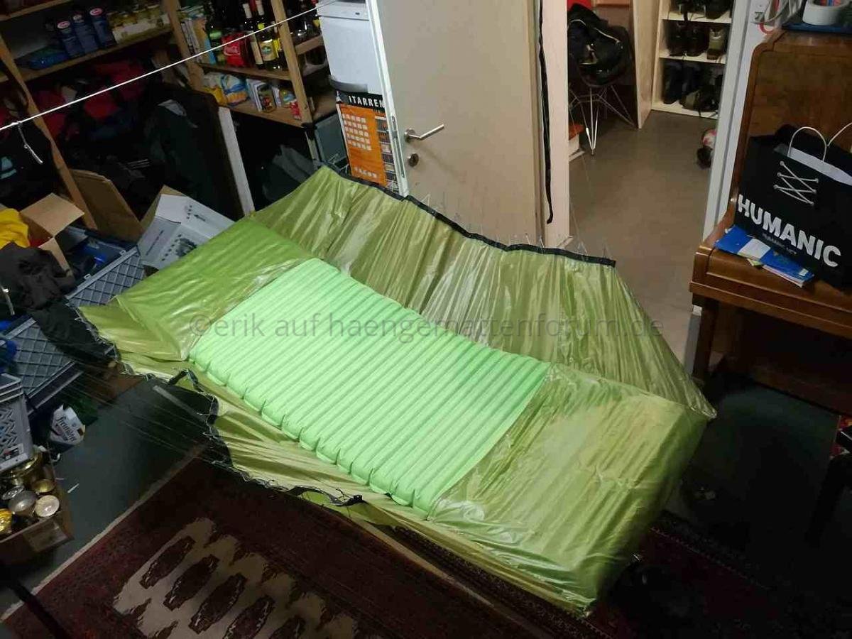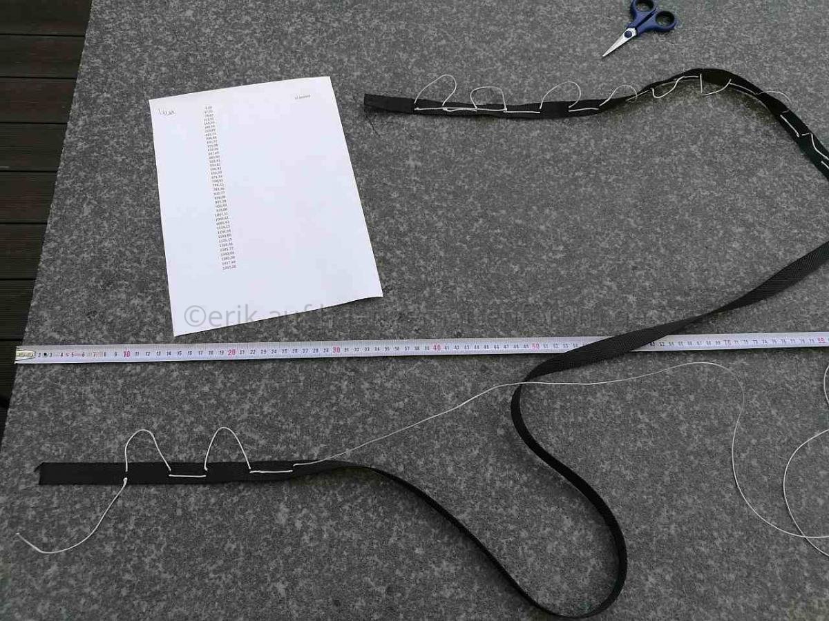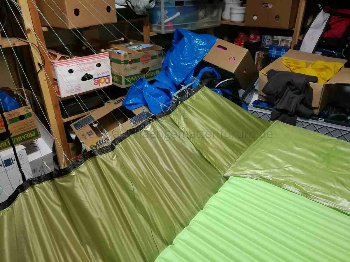 Nachdem mein 90° Prototyp ganz gut zu liegen war, hab ich mich gestern an die Herstellung einer Version 1 gewagt. Nachdem ich einige Kilos auf die Waage bringe, war ich auf der Suche nach einem System, mein Gewicht möglichst gleichmäßig auf den Stoff zu übertragen. Deshalb habe ich (ist natürlich nicht ultraleicht) zwei Gurtbänder auf beiden Seiten verwendet. Eines, um das ich das Stoffende gewickelt und damit gesäumt habe, und eines, in das ich 1mm Dyneema als Schlaufen genäht habe. Beide hab ich dann gut vernäht. Macht bei 20 Schnüren pro Seite 40 Abspannungspunkte an der Matte.