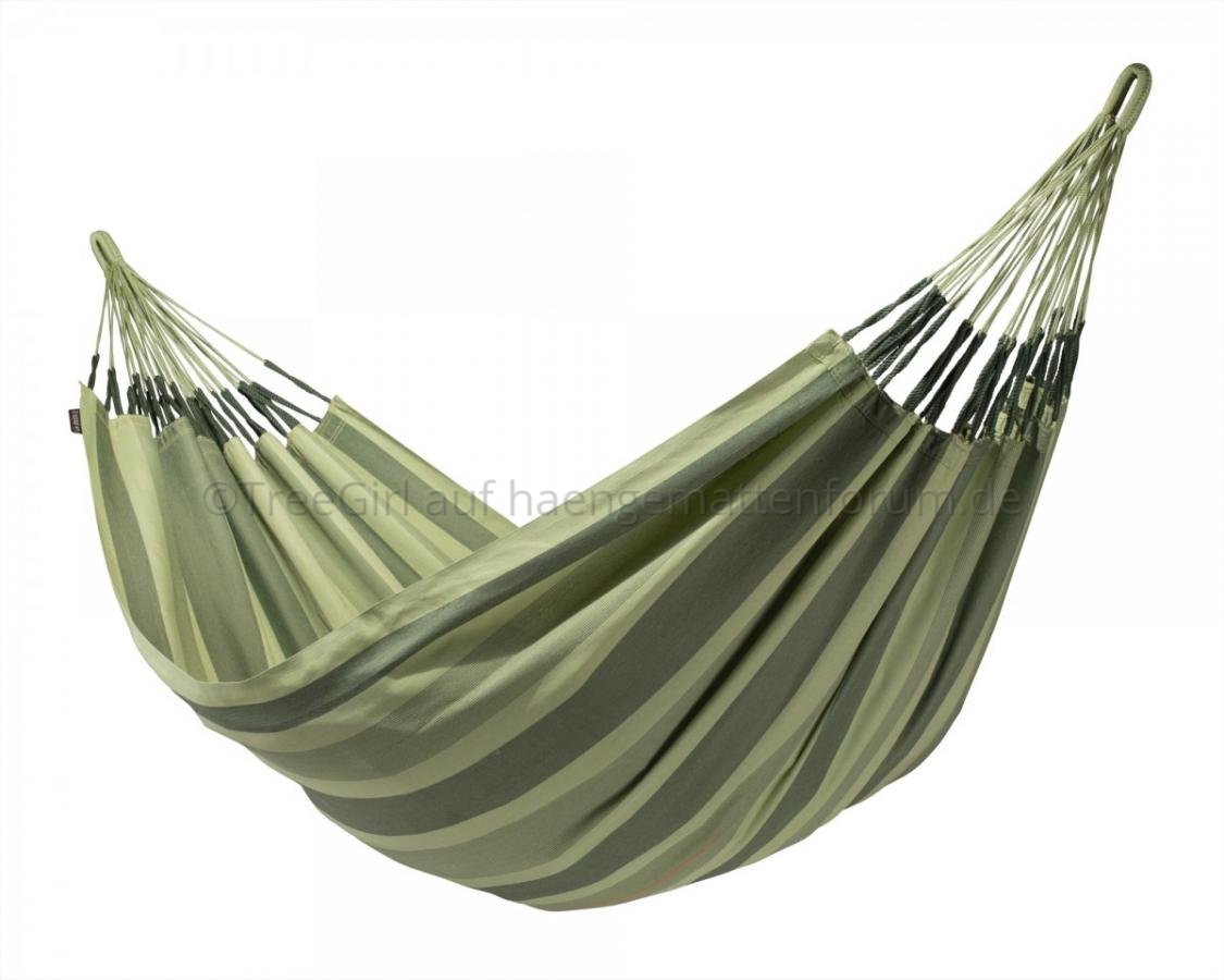Jetzt habe ich versucht meine einlagigen Hängematten mit zwei Schnüren abzuspannen. Aber das wirkt bei weitem nicht so natürlich. Dort wo die Schnüre angebracht sind, gibt es eine unschöne Spitze. Außerdem faltet sich der Stoff in der Mitte zusammen, weil die Schnur dort keinen Einfluss hat. Und bei jedem Windhauch bläht sich die Hängematte wie ein Segel.