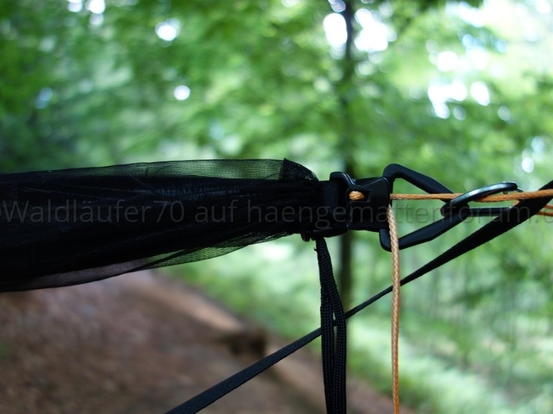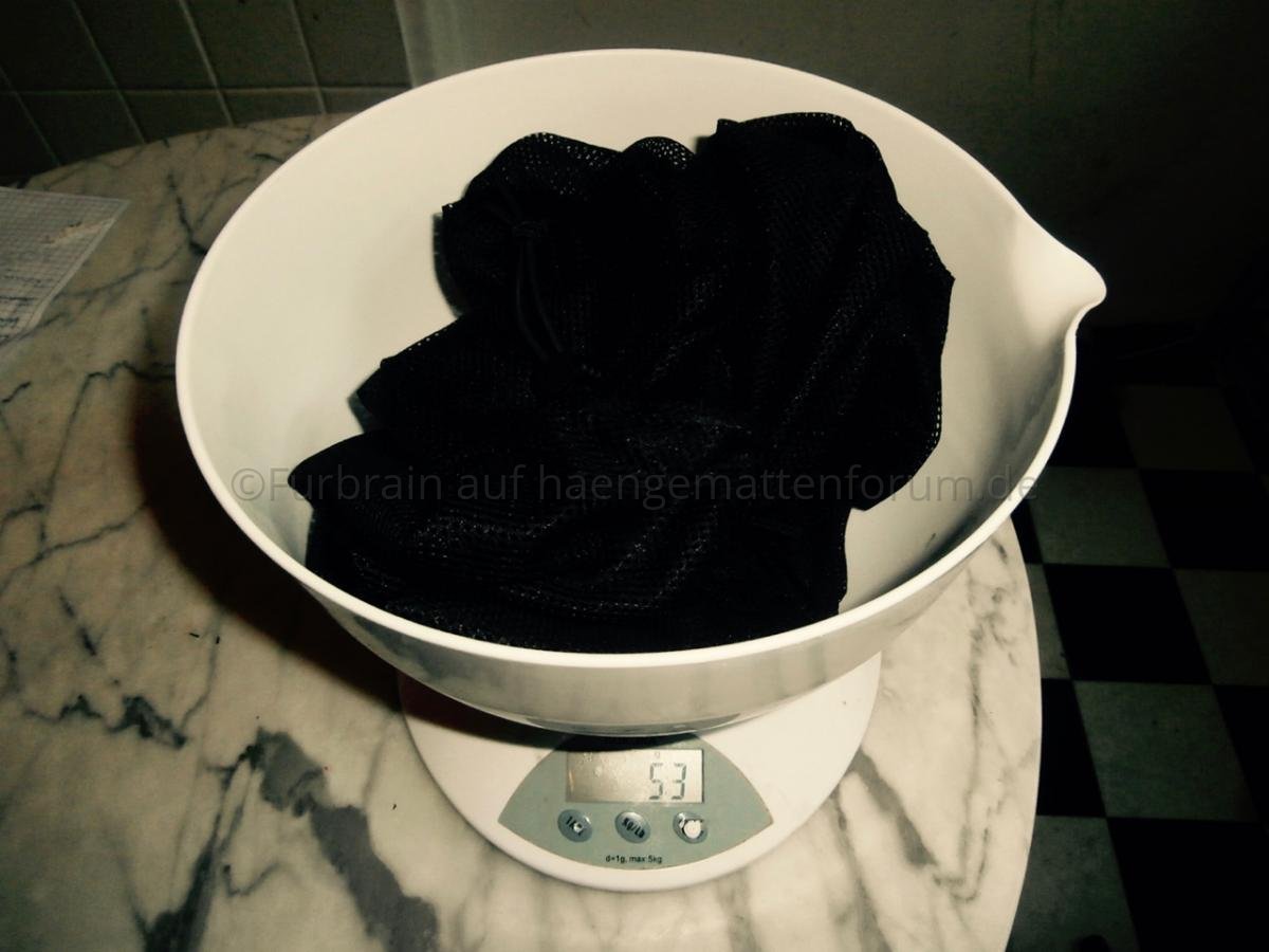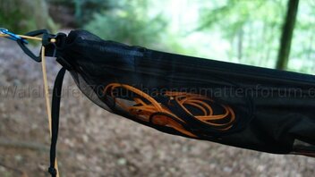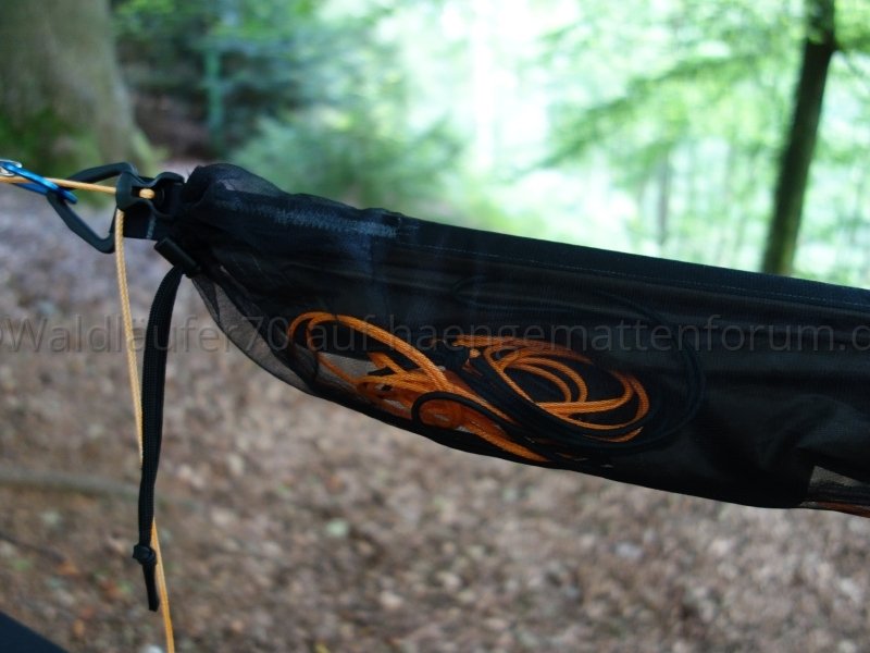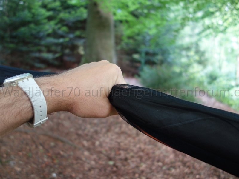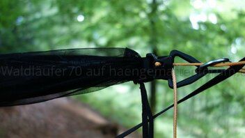 Die 370 cm lange Netzfutter-Schlange mit einem Durchmesser von etwas mehr als 6 cm wiegt inkl. zweier 4-mm-Gummikordeln und zwei großer Tankas zweier 2-mm-Gummikordeln und zwei Mini-Tankas insgesamt 53 g (siehe Foto). Somit kommt das Tarp-Sleeve alleine wohl knapp auf unter 50 g. Das erste Ziehen über das Warbonnet Thunderfly inkl. der von mir angebrachten Gummizüge und Handschuhaken zum fixieren der Türen am Kopf- und Fußenende gestaltete sich einfach und ohne Probleme. Dass das Sleeve aus drei zusammengenähten Teilen besteht, hat die Flexibilität und auch die Stabilität des Schlauches beim Drüberziehen nicht spürbar eingeschränkt.