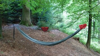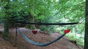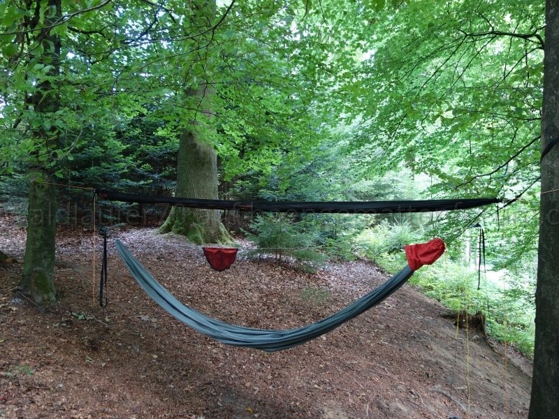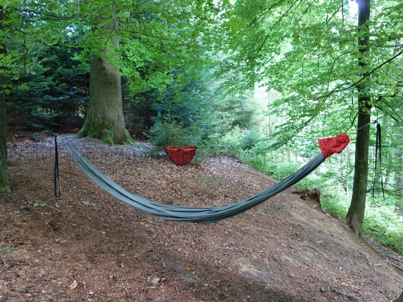 Und wenn ich schon dabei bin, stelle ich hier mit einem Foto noch meine Hängematte aus Hexon 1.6 vor: rund 342cm lang und etwa 147cm breit. Kopf- und Fussende habe ich mit einer leichten Kurve versehen, so dass die Hängematte in der Mitte etwas kürzer ist als am Rand. Die Folge davon ist, dass ich trotz dem etwas dehnbareren Stoff keine Rückenschmerzen bekomme, da Kreuz und Gesäss mehr unterstützt werden. Zudem kann ich sehr flach darin liegen und brauche dazu nur wenig diagonal zu liegen. Die Ridgeline habe ich aktuell auf ungefähr 300cm eingestellt, der Hängewinkel ist eher etwas flacher als 30°.