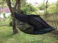 Ok, also ausgepackt und zuerst die originalen Bänder der Hammock entfernt und durch die Whoopie-Slings ersetzt. Dies funktionierte relativ gut, um die Slings durch die Matte zu fädeln habe ich die Stange des Moskitonetzes benutzt. Karabiner eingehangen, fertig. Den Sleeve anschließend über die Matte zu ziehen war sehr mühselig (im Gegensatz dazu geht es sehr leicht und schnell wenn die Matte hängt).