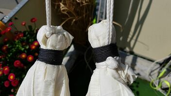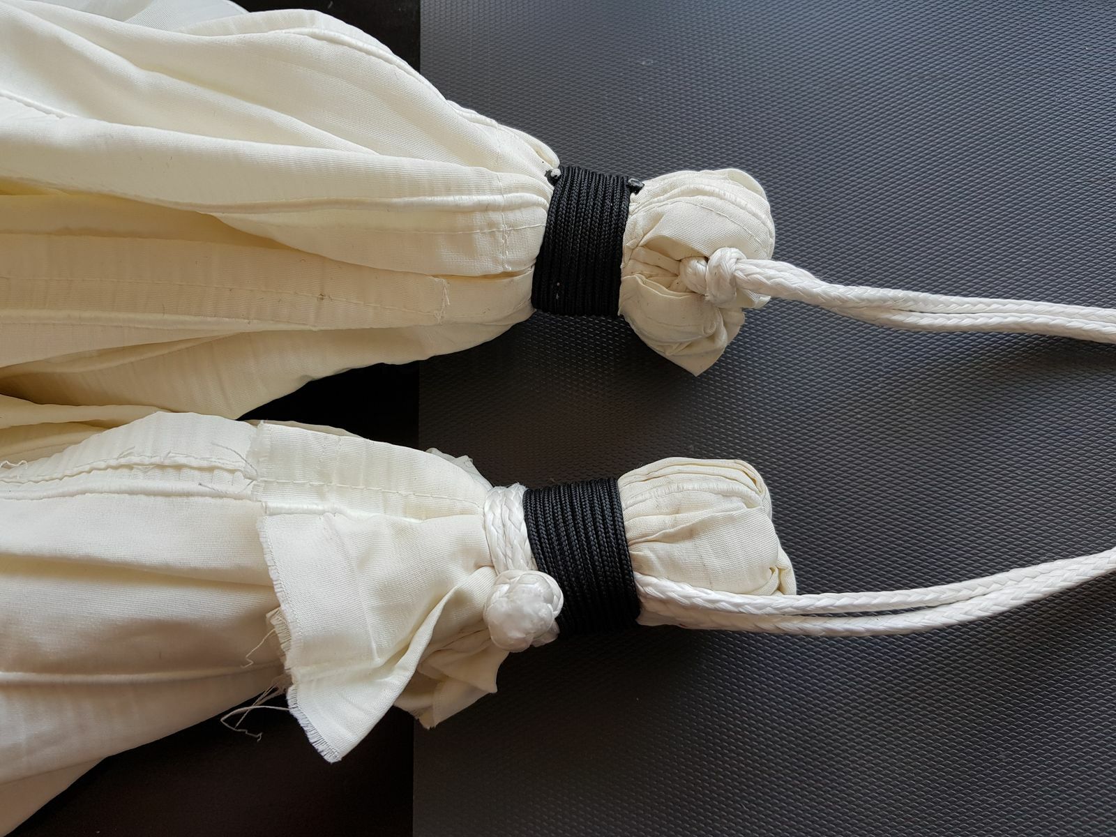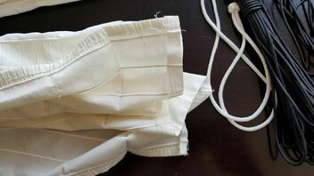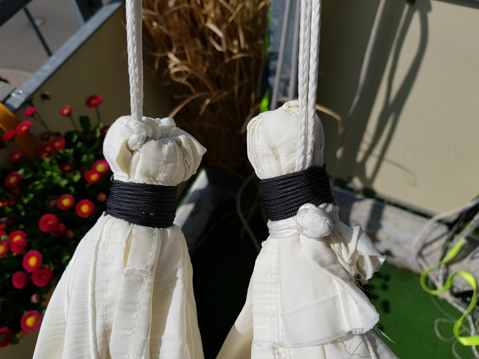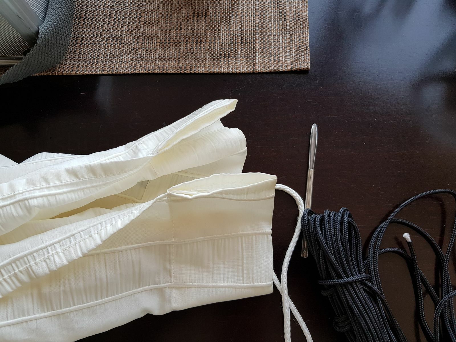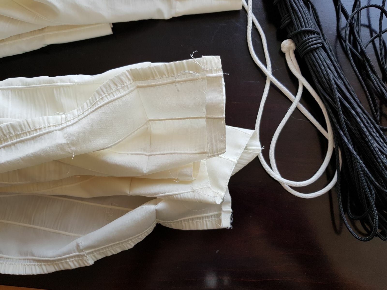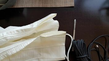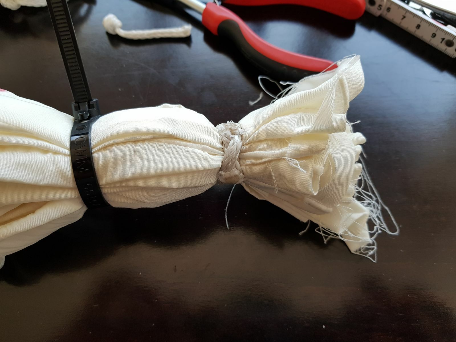 Für die Raffung kannst du Bindfaden oder Zahnseide nehmen. Ich finde es von Vorteil, wenn die Schnur etwas rauer ist, weil der Knoten dann besser hält.
