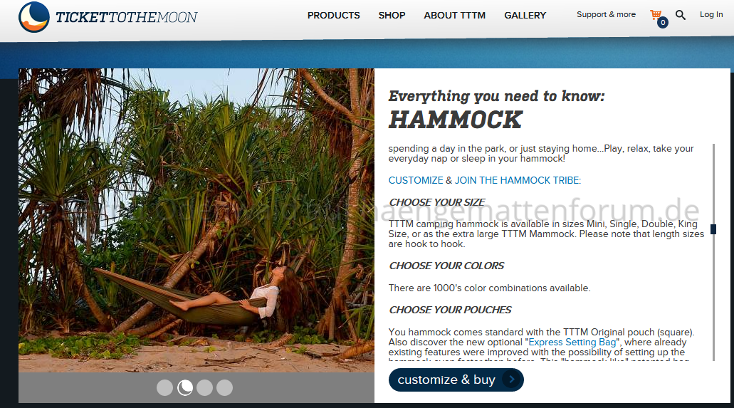 • Ich bin auf die Hängematten von Ticket to the Moon gestossen, kurz nach dem meine Bestellung für eine ENO Double Nest raus ist. Ich war inzwischen immer wieder mal auf der Website von TttM und habe mir überlegt, ob ich mir eine bestellen soll, denn ich hielt einen Längenunterschied von 35cm für doch recht bedeutsam.