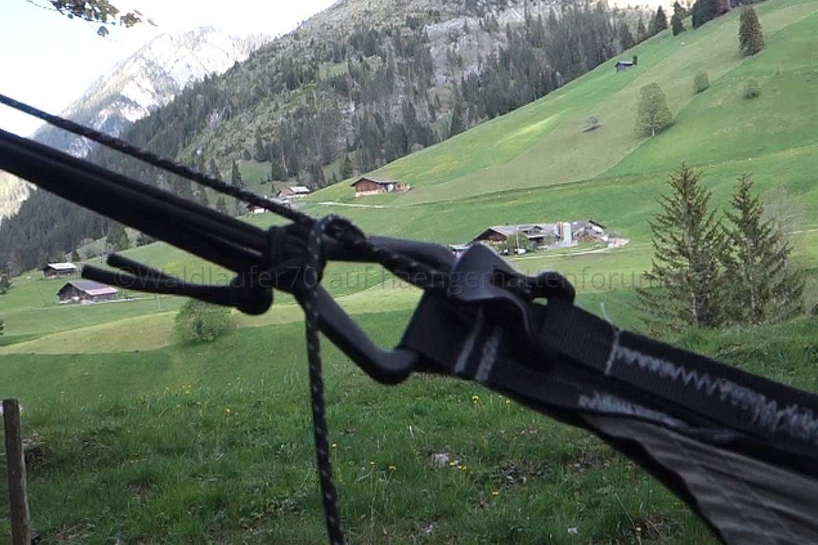 An der Prusikschlaufe hänge ich mit einem kleinen Karabiner die Spannschlaufen des Tarps ein. Am Tarp selbst befinden sich kleine Spanner. Mal schauen, ob ich davon noch ein Foto finde...