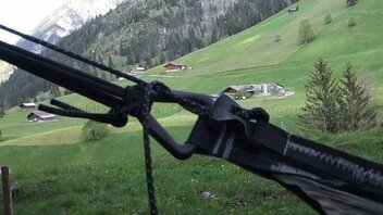 Am Tarp selbst ist die Aufhängung einerseits mit einem Gummiseil befestigt, mittels Kordelspanner kann es gespannt werden.