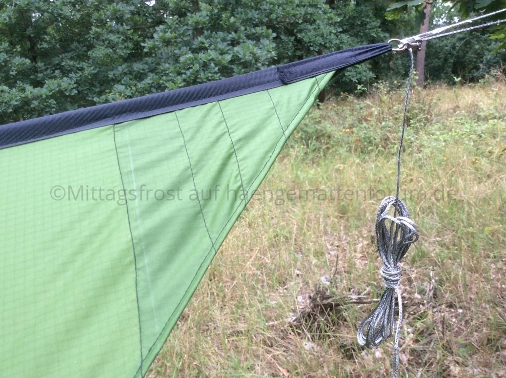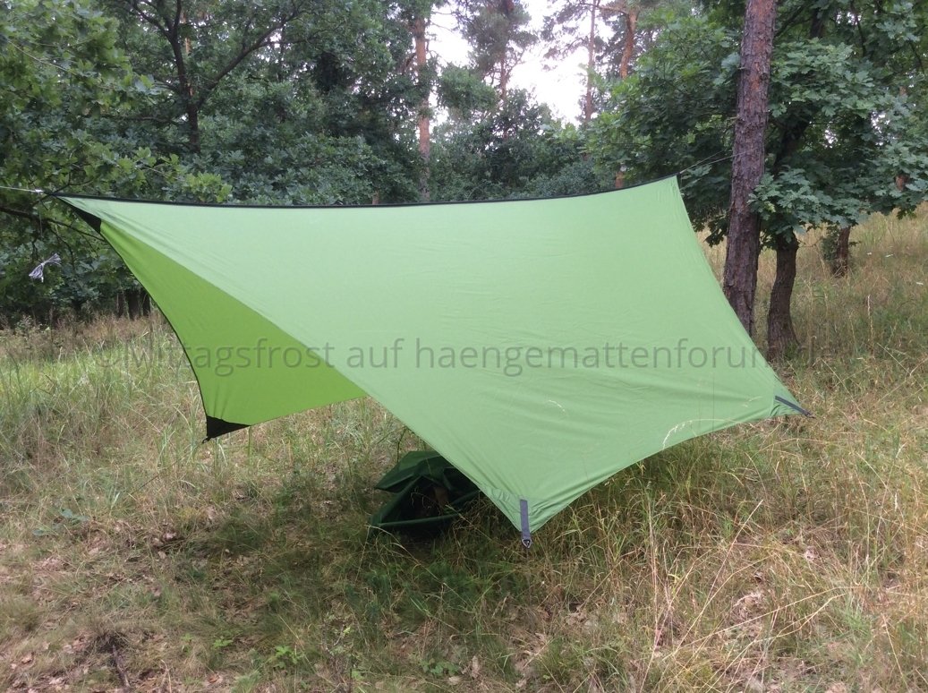 So, langer Rede kurzer Sinn - hier die technischen Daten: 427 Gramm für ein Hex-Tarp mit einer Breite von 2x1,55 m und einer Länge von 3,35 m sind durchaus erträglich. Länger und leichter als mein DD Superlight Tarp (460 g). Die Nähte sind zwar immer noch schief und krumm, aber was soll? Mir gefällt's trotzdem.