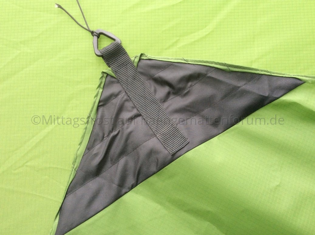 An einer Stelle bin ich von der Anleitung abgewichen- Mir gefällt die französische Naht mit Satinbandabdeckung, wie sie Warbonnet verwendet, doch besser. Näht sich auch einfacher, wie ich finde. Als Material für die Verstärkung an den Abspannpunkten (dort, wo die Kräfte wirken), habe ich den schwarzen Stoff eines kaputten Regenschirms verwendet. Er sollte sich nicht mit Wasser vollsaugen, da ja Regenschirme eigentlich nur ein Tarp mit Stiel sind. ![]()