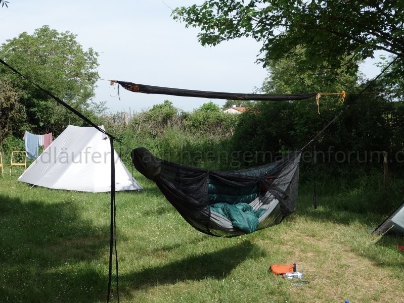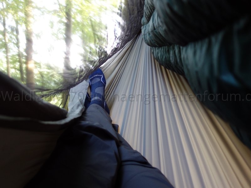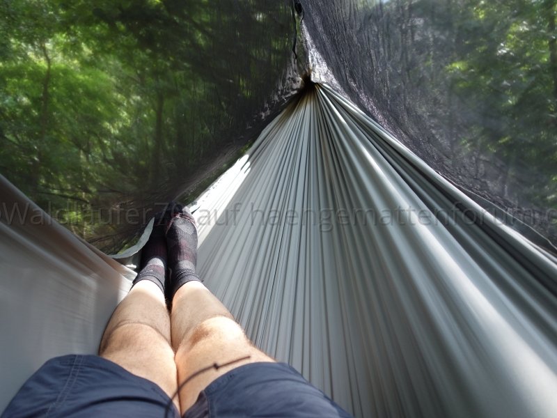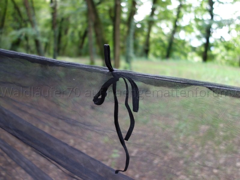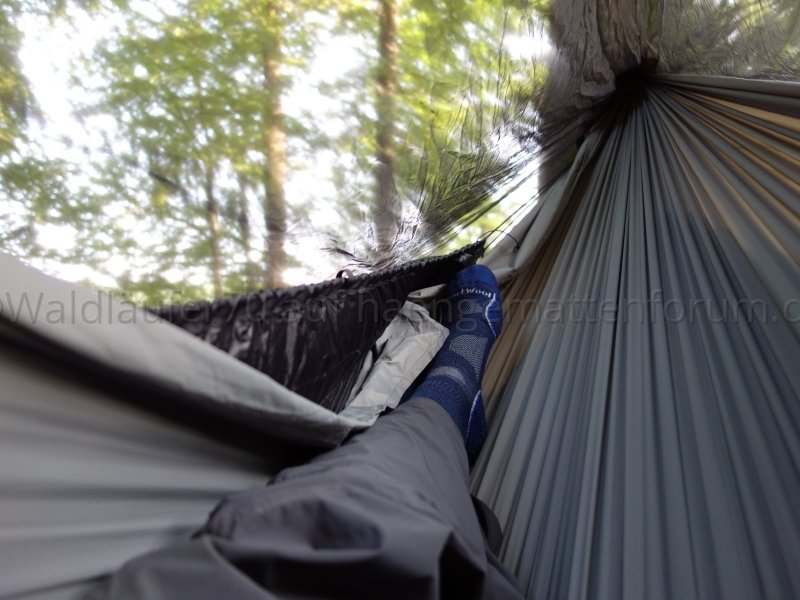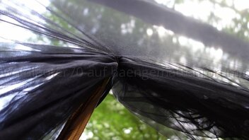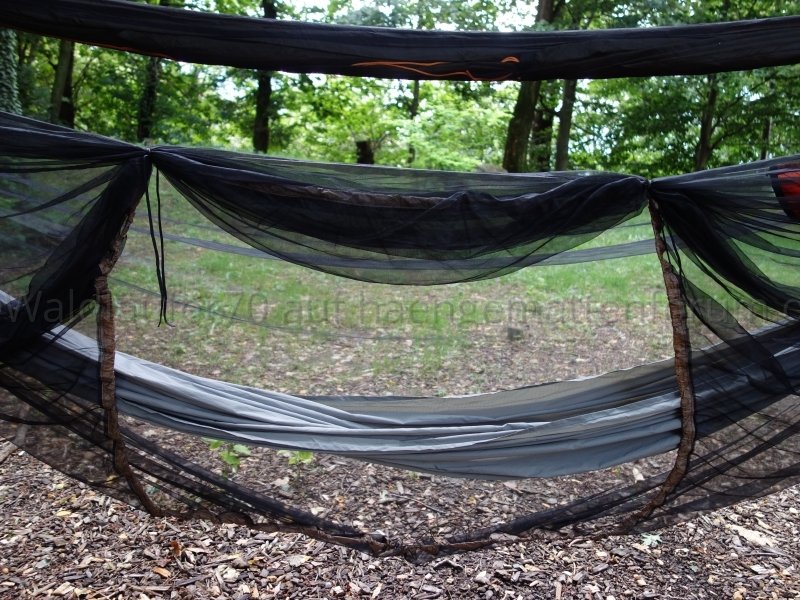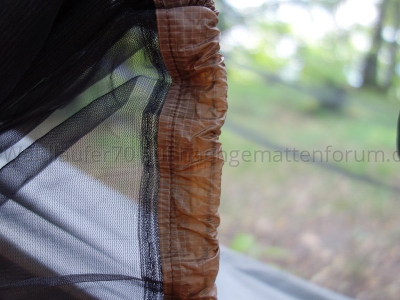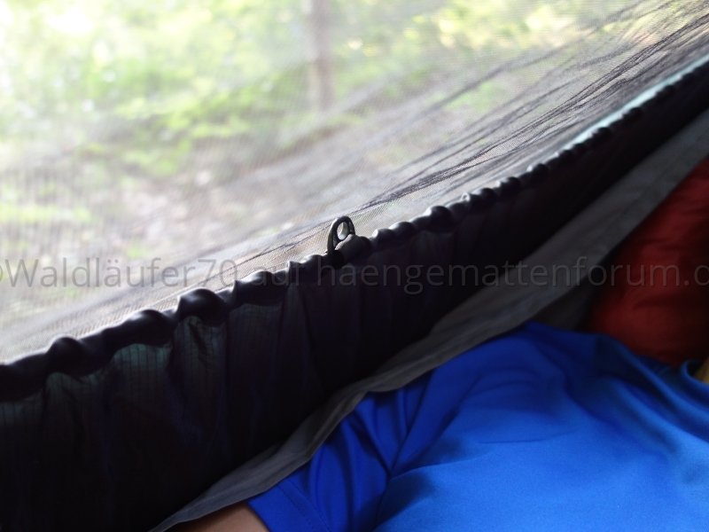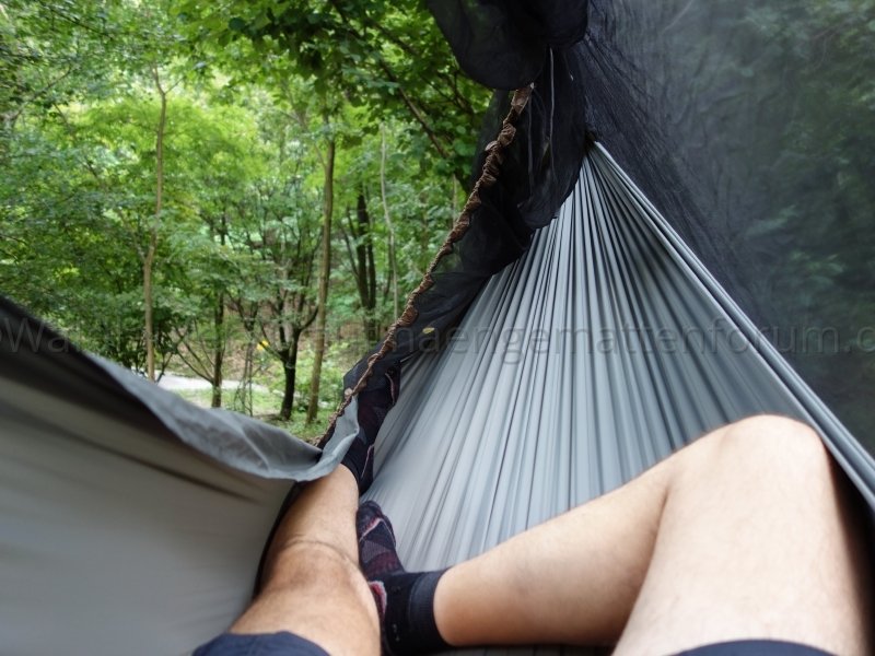 Ich finde, man sieht schön, wie das Netz unten wunderbar an Hängematte respektive Unterquilt anliegt und damit einen weitgehend insektendichten Abschluss bildet: