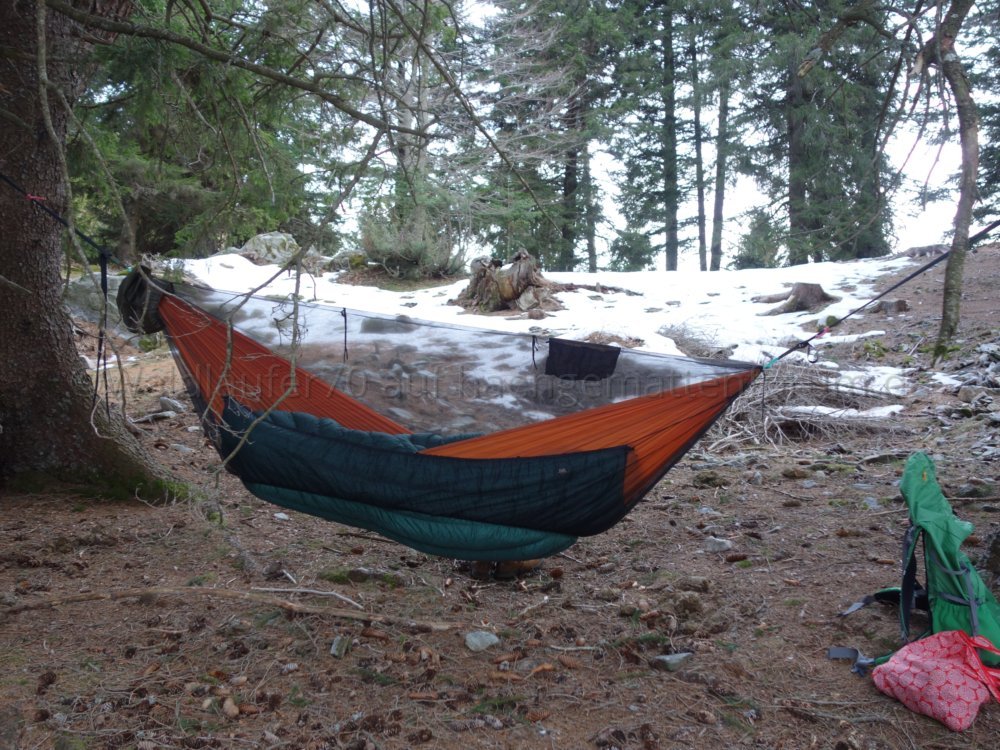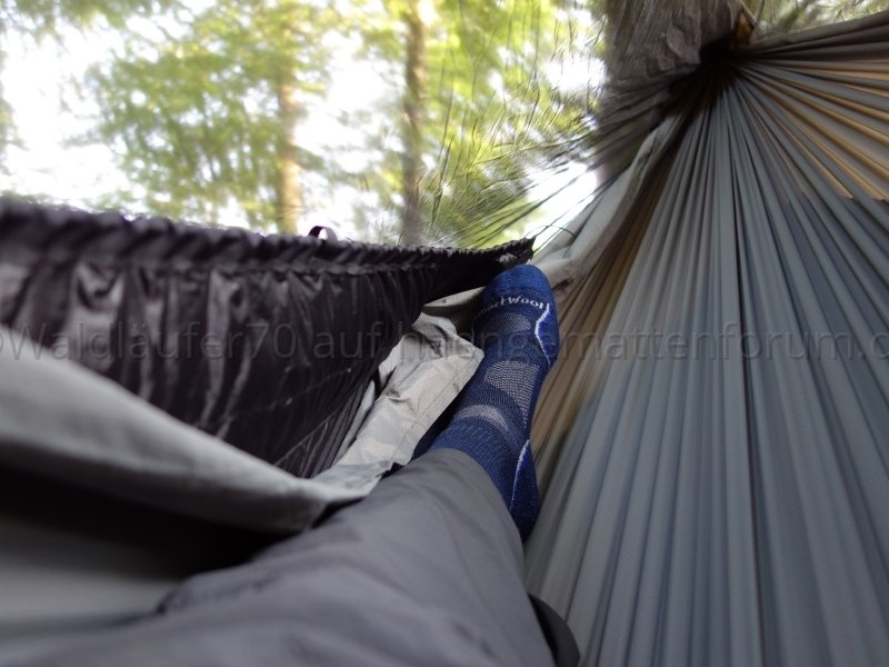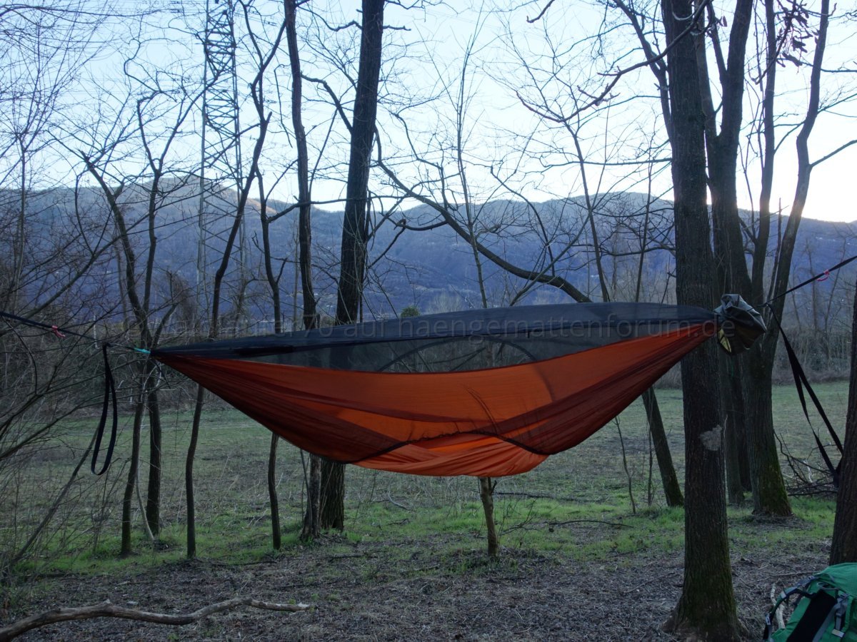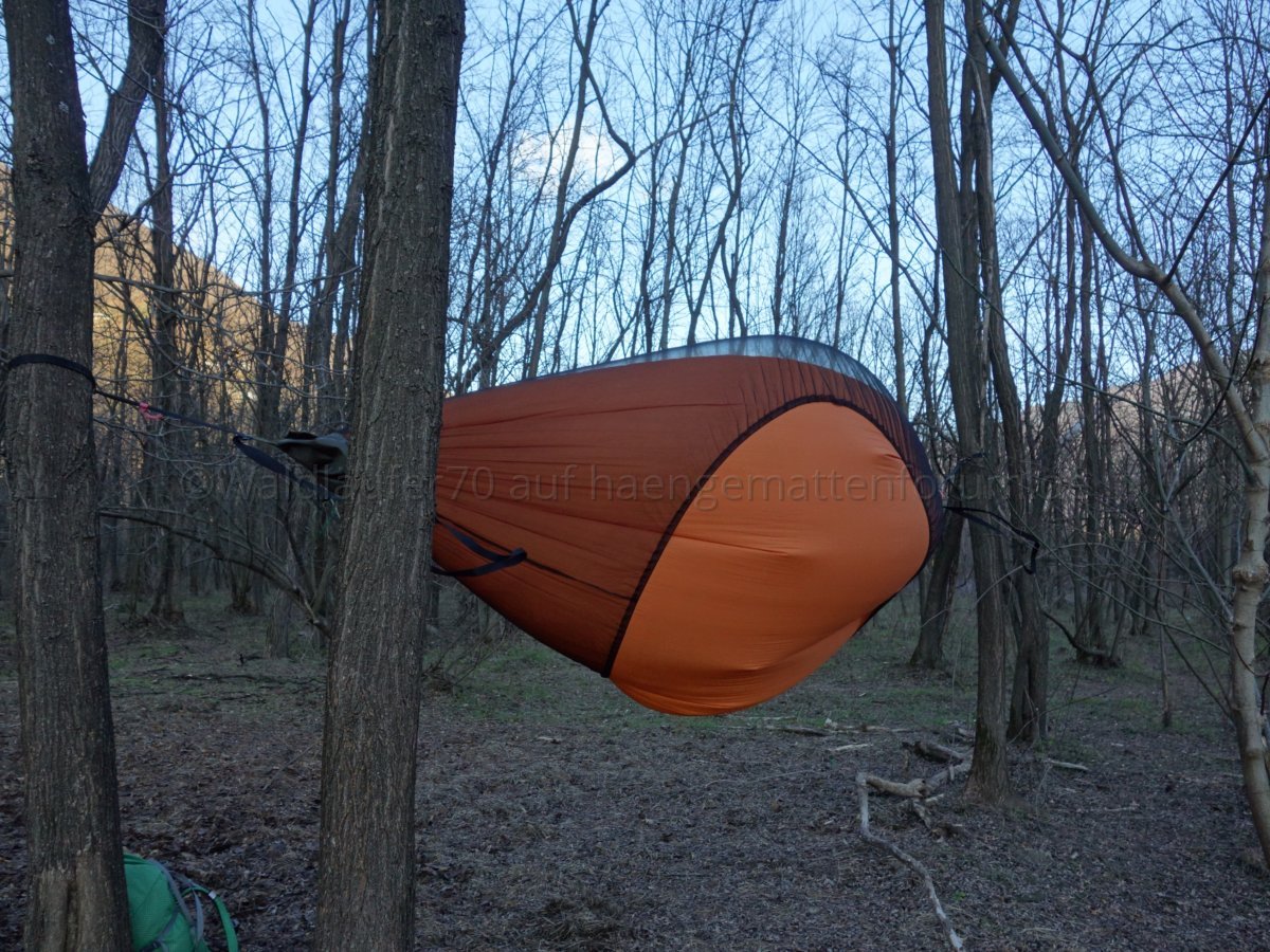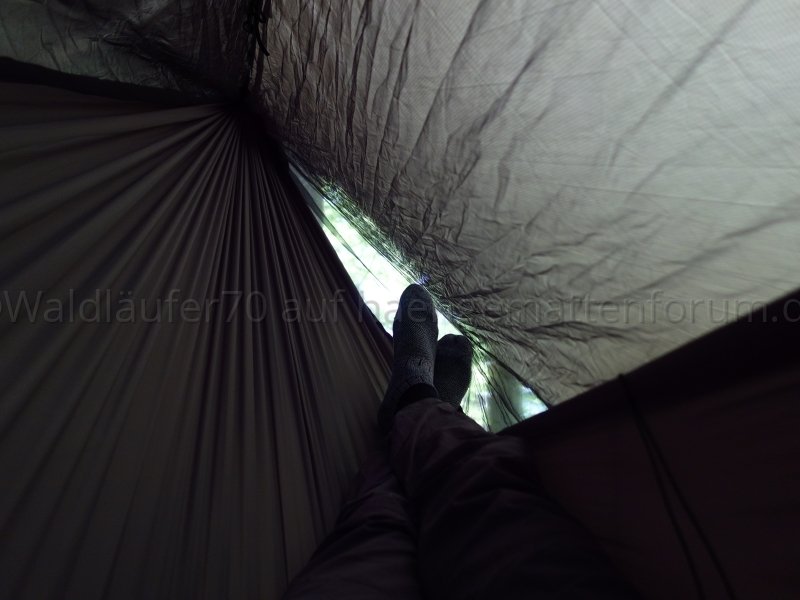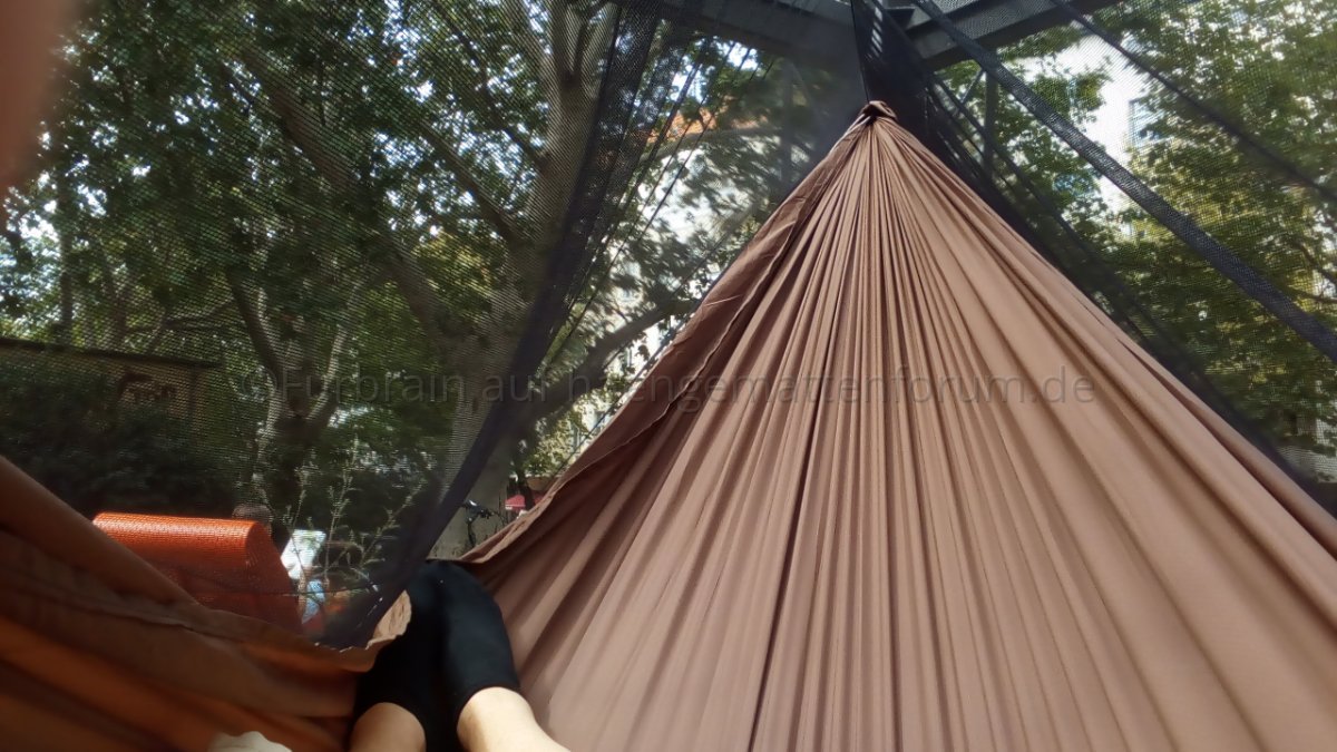 Ich finde, man sieht schön, wie das Netz unten wunderbar an Hängematte respektive Unterquilt anliegt und damit einen weitgehend insektendichten Abschluss bildet: