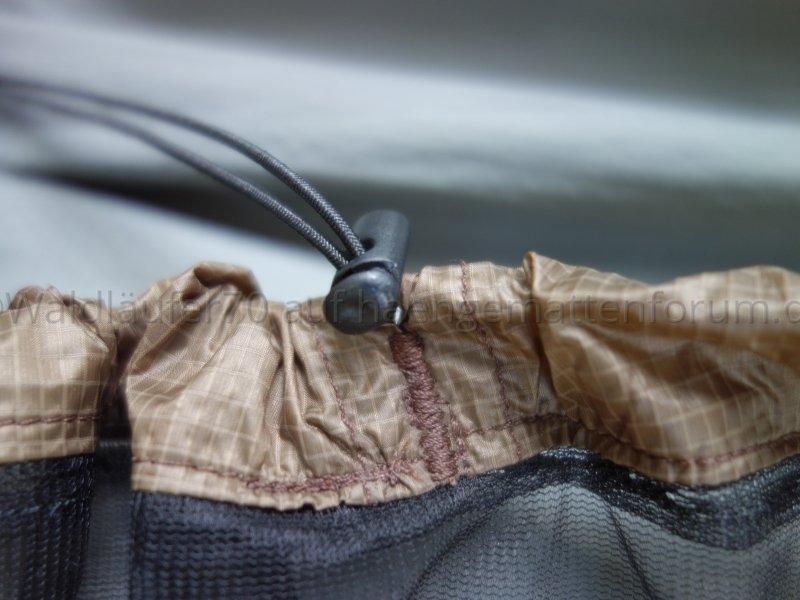 Zum Verschliessen des Netzes wird die Gummikordel so stark festgezogen, dass der Kordelzug von unten der Kontur des Körpers folgt und sanft anliegt. Bei Verwendung des Underquilts funktioniert das sehr gut: Die Gummikordel liegt dann ganz leicht am Underquilt an und sorgt für einen recht guten Abschluss. Da die Stechmücken der Körperwärme und dem CO2 folgen, besteht keine Gefahr, dass sie unten zwischen Netz und Underquilt einen Zugang suchen. Ohne Underquilt könnte es passieren, dass Stechmücken von unten durch die Hängematte stechen und allenfalls sogar - aus Versehen - bis ins Innere der Hängematte durchschlüpfen könnten.