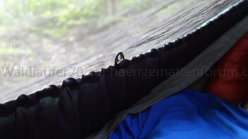 Durch die weit geöffnete 5-cm-Öffnung kann man das Moskitonetz über die Aufhängung der Hängematte schieben, wenn man es aus dem Weg haben will. Natürlich nur, wenn man noch keinen Quilt mit drin hat ;)