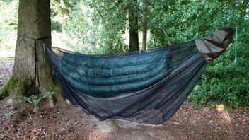 • Möglichkeit 1 ist äusserst schnell aufgebaut und funktioniert auch sehr gut: Der Underquilt wird ausserhalb des Moskitonetzes an der Aufhängung der Hängematte eingehängt. Das Moskitonetz wird zwischen Hängematte und Quilt zusammengezogen. Insgesamt finde ich das recht angenehm und einfach zu handhaben. Der kleine Nachteil: Das Moskitonetz hängt etwas nach innen.