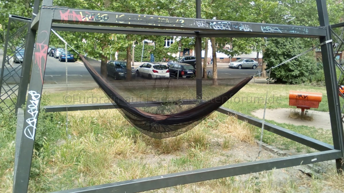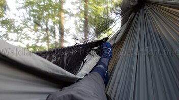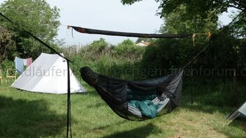 Die Hängematte hatte ich da an zwei etwa acht Meter voneinander entfernten Bäumen aufgehängt. Dazu musste ich zwei Bamgurte aneinander hängen. Die Hängematte hing da unbelastet auf etwa 80cm Höhe. Wenn ich mich reinsetzte oder -legte, sank sie jeweils auf etwa 30cm. Auf die grosse Strecke kommt die Elastizität der Polyester-Baumgurte doch stark zum Tragen. Da wären Gurte aus Dyneema-Faser wohl besser geeignet. Andererseits war der Bounce-Effekt noch recht lustig, da ungewohnt.