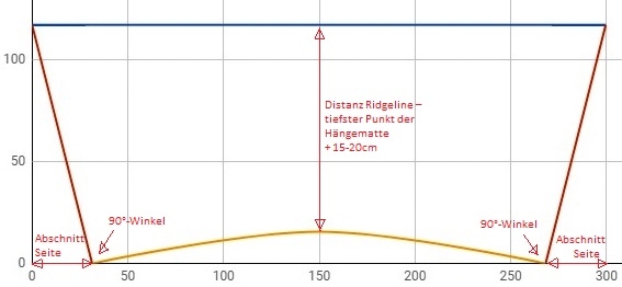 • Blaue Linie = maximale Ridgelinelänge plus etwas Zugabe für den Kordelzug auf beiden Seiten (so man einen macht) und grundsätzlich für etwas Spielraum (Schutz des Netzes).