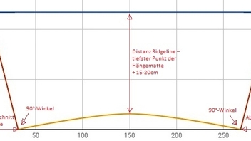 Bei einem Hängewinkel von 30° liegt der tiefste Punkt der Hängematte rund ein Viertel der Hängemattenlänge unter der Ridgeline.