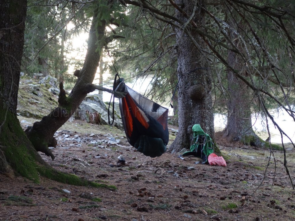 • Gestern, auf der Alp Mornera im Tessin, hat mein Bruder ein paar Fotos von meinem Hängematten-Setup mit dem Moskitonetz gemacht. Alleine ist das immer schwierig...