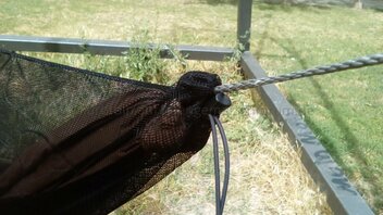 • Ich wollte ausprobieren, wie gut ein Netz mit Öffnung unten (Gummizug) für eine so grosse Hängematte funktioniert.