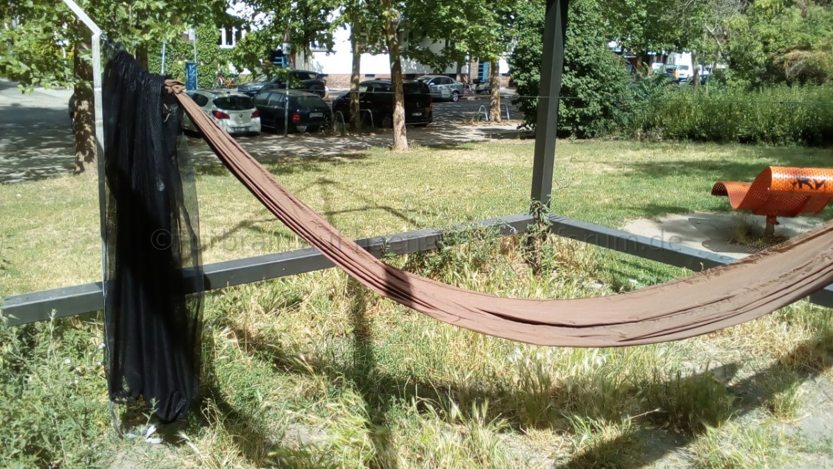 • Da das von mir verwendete Netz nur 137cm breit ist und durchs Zusammennähen oben und das Nähen des Kordelzugs unten noch etwas Material verloren gegangen ist, lässt sich das Netz unten von der Seite zur Mitte hin nicht vollständig zuziehen. Aber das gilt umso mehr in Längsrichtung: Die Hängematte ist zu lang, um das Netz unten vollständig verschliessen zu können. Bei sehr langen Hängematten dürfte es sich allenfalls empfehlen, das deutlich breitere Netz von Extremtextil (siehe oben) zu verwenden. Allerdings hätte das wiederum den Nachteil, dass das Netz sehr schnell den Boden berühren würde. Das kann selbst mit meinem eher schmalen Netz passieren, wenn man die Hängematte zu tief hängt. Ist der Gummizug unten aber bereis leicht zusammengezogen, so ist diese Gefahr weitgehend gebannt, zumindest mit dem schmaleren Netz von DutchWare.