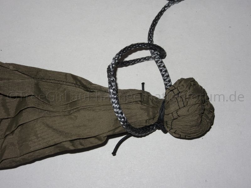 Ich selber habe bisher erst den Warbonnet Whip ausprobiert: Ich habe also einfach die Enden der Hängematte mit einem Stück Schnur durch den Kanal zusammengebunden. Befestigt habe ich die Dog Bones (oder Continuous Loops oder Whoopie Slings) mit dem von TreeGirl gezeigten "Knoten". Bisher ist auch mir da nichts verrutscht. Allerdings habe ich die Schlaufe ziemlich direkt unter dem Saum des Tunnelzugs angesetzt. Das hat sicher mitgeholfen, dass bisher nichts verrutscht ist. Ich glaube aber sofort, dass es auch einfach so hält. Der Saum gibt einfach ein zusätzliches Gefühl von Sicherheit.