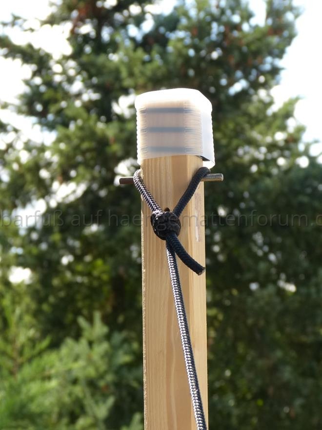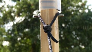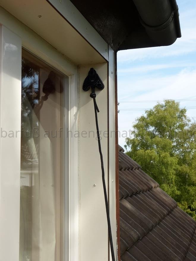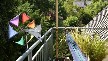 Es ist nicht ganz optimal, weil der Balkon in der Diagonale 4,70 m lang ist, die Aufhängungshöhe aber nur 1,80 m. Aber es geht. Am Geländer direkt konnte ich nichts befestigen, weil es zu niedrig ist und auch nicht stabil genug, weil es nicht an der Hauswand angeschraubt ist. Lediglich an den Ecken ging es. Deshalb habe ich dort mit sehr dicken Kabelbindern eine Holzstange befestigt (4,4 x 4,4 cm). Am anderen Ende habe ich einen La Siesta Wandhaken an den Balken der Dachgaube geschraubt. Bisher hält es.