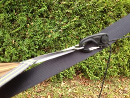 Die Abspannung zum Boden hin funktioniert auch gut, hier bevorzuge ich aber wegen der höheren Flexibilität eindeutig die Hook worms von Dutch. Nicht, daß die von AMAZONAS gelieferte Abspannschnur mit dem roten Seilspanner aus Aluminium schlecht wäre. Ganz im Gegenteil: es ist eine leichte, gut handhabbare und zuverlässige Abspannung. Ist der Abstand Tarpunterkante - Hering jedoch kürzer als die halbe Schnurlänge, dann läßt sich die Schnur nicht mehr per Seilspanner verkürzen und man muß improvisieren. Bei den Hook worms gibt es keine Mindestlänge. Hier könnte im Prinzip die Tarpunterkante direkt am Hering sein.