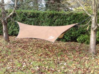 Als ich dann nach etwa einer Stunde wieder aufwachte, schien kurzzeitig wieder die Sonne. Durch die Feuchtigkeit hatte die Spannung des Tarps etwas nachgelassen, aber das ist bei allen Nylontarps so. Durch Hin-und-her-Schütteln ließen sich die meisten auf dem Tarp verbliebenen Wassertropfen entfernen. Der Abbau ging wieder sehr bequem vonstatten. Wie schon gesagt wären etwas größere Ecktaschen zum Verstauen der Abspannschnüre von Vorteil. Zum Einpacken des Tarps in den Packbeutel kann ich noch nichts sagen, da ich es zum Trocknen im Gartenhaus aufgehängt habe.Das Braun des Tarps finde ich sehr schön. Die graue Einfassung und vor allem die neongelben Nähte treffen meinen Geschmack nicht, stören mich aber auch nicht. Wenn das auffällige Logo noch kleiner und vor allem dezenter (vielleicht in einem anderen Braunton?) gestaltet wird, dann ist es aus meiner Sicht ein schönes Tarp. Die Größe ist perfekt, vom Gewicht her verdient es wirklich die Bezeichnung "ultraleicht" und der Preis ist auch in Ordnung. Kaufempfehlung von mir.