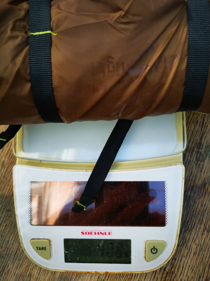 Da Packsack und Heringe mit Minipacksack 60 gr wiegen, bleibt für das Tarp mit Schnüren nur 348 gr. Das freut den Grammjäger in mir.