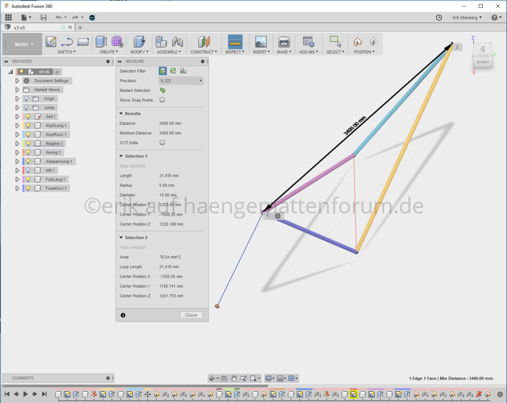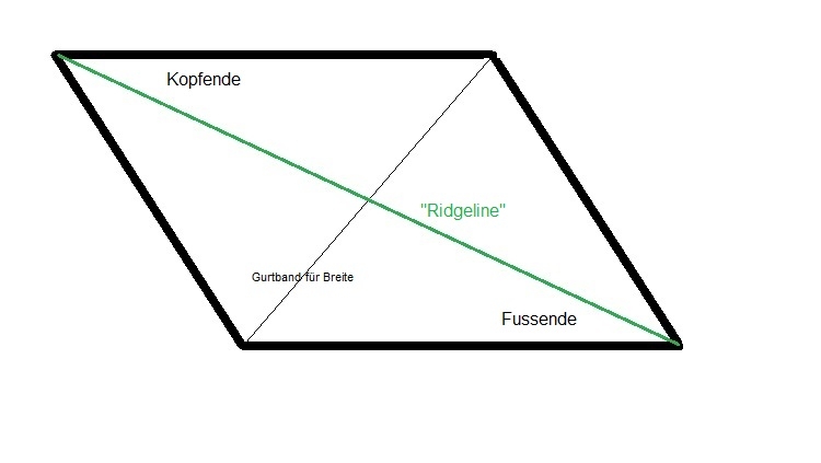 Es kann aber durchaus sein, dass man die Masse nicht zu knapp wählen darf. Die Winkel zwischen den Dreieck-Flächen und der Hängematte sind sehr klein. Bei der 3m-Ridgeline scheinen mir die Winkel etwas zu steil.