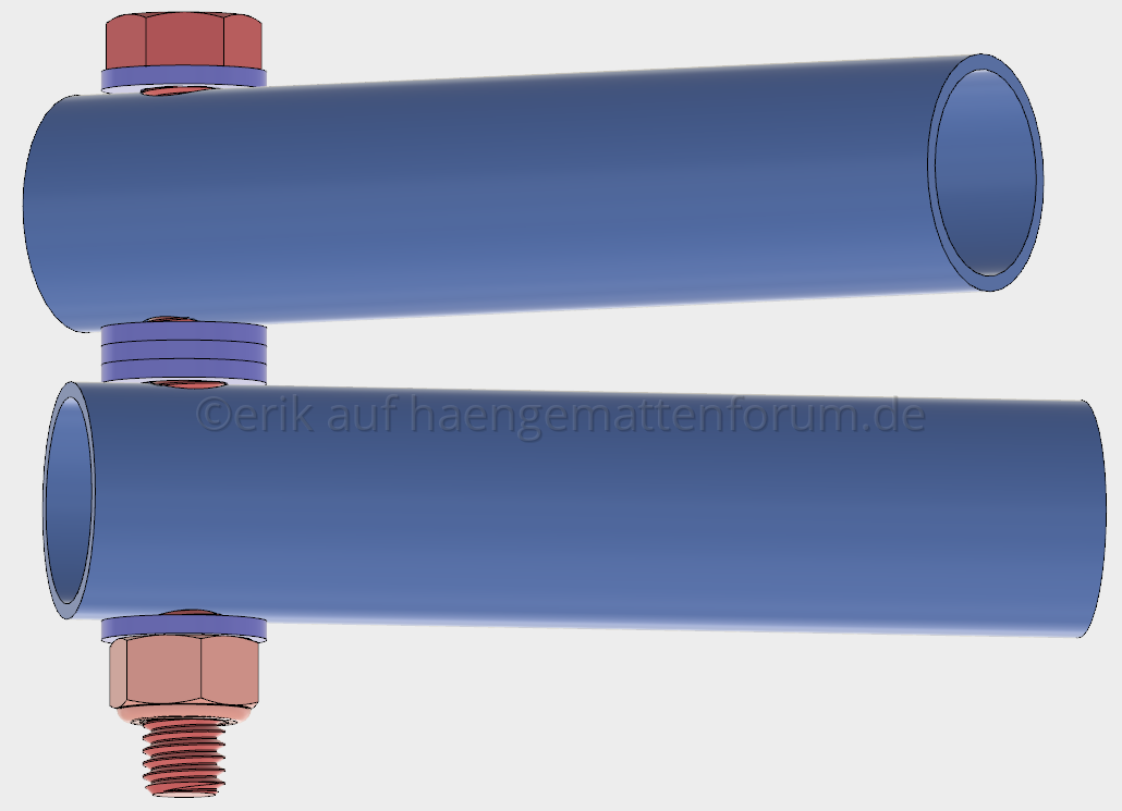 Die Rohre erfahren ausschliesslich eine Druckbelastung (beide Enden fixiert)! Der Punkt ist, dass der Erfinder mit seinem Hammock Stand sehr nahe an den Minimalmassen ist. Dadurch kann er schwächere Rohre nutzen, als wenn man die Längen erhöht. Je länger ein Rohr mit gleicher Stärke ist, desto leichter könnte es sich durchzubiegen beginnen. Das darf unter keinen Umständen passieren.