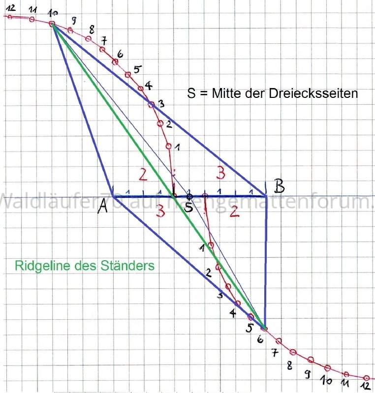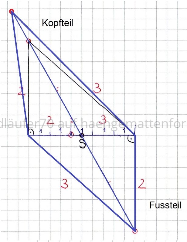 Wenn du, [USER="173"]erik[/USER], magst, so kippe das Modell doch mal mit Blick von oben so lange in Richtung Kopfende, bis die Ridgeline exakt über Punkt S zu liegen kommt. Wie hoch liegt dann der Aufhängepunkt für das Kopfende, wie weit der Aufhängepunkt für das Fussende über dem Boden? (Natürlich kommt es dabei auch noch darauf an, wie lang man das Gurtband am Boden einstellt und welche konkreten Längen man für die Balken wählt.)