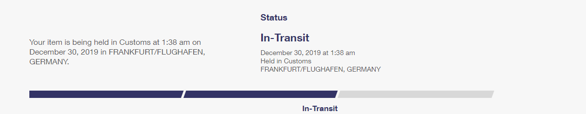 Das Tracking hat ohnehin nie 100%ig zuverlässig funktioniert, aber im letzten halben Jahr kann man es getrost vergessen. "In Transit" heisst nur, dass es seitdem nicht wieder gescannt wurde und vermutlich beim Zoll verstaubt. Ich habe den Verdacht, dass man in Deutschland gar nicht mehr scannt, um dem Nutzer nicht zu verraten an welcher Stelle es hakt. Es gibt bestimmt genug Leute, die ungeduldig in Frankfurt oder Speyer anrufen, wenn sich die Sendung eine Woche lang nicht bewegt.