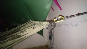 Was ich - wie schon die anderen Tester - vermisse, ist die Möglichkeit, die Länge der Ridgeline zu regulieren. Sie hing bei mir trotz passenden Hängewinkels ziemlich stark durch. Ich würde eine Whoopi-Sling dafür verwenden. Desweiteren schien mir das Topcover etwas zu schmal geschnitten. Eine Handbreit mehr Stoff könnte es meiner Meinung nach vertragen.