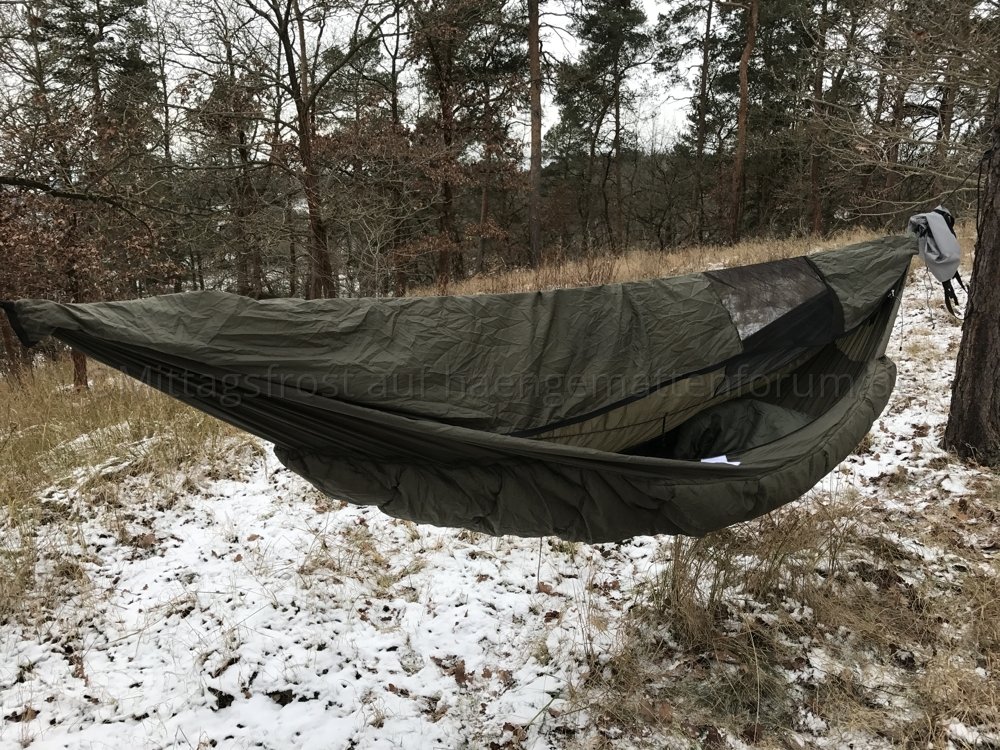 Das derzeitige Design ist eine 100%ige Verbesserung gegenüber dem Design, das ich auf dem Hängemattentreffen im Sommer testliegen durfte. Die Hängematte selbst ist länger und damit bequemer geworden; ich habe ziemlich genau 11’ von Ende zu Ende gemessen :thumbup: Außerdem ist die Isolierung nicht mehr zentriert sondern diagonal aufgebracht.
