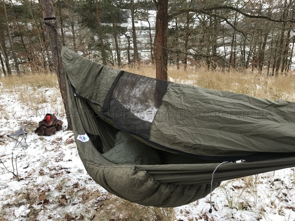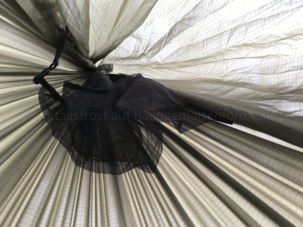 Das Moskitonetz ist bei der Winterversion eigentlich nur ein Guckloch im geschlossenen Oberteil. Das gefällt mir sehr gut. Einerseits verhindert die winddichte Stoffbahn, daß warme Luft weggeweht wird (Windchill), andererseits kann im Kopfbereich die feuchte Atemluft fast ungehindert abziehen, was Kondensationsprobleme verhindert. Aus meiner Sicht sehr gelungen!