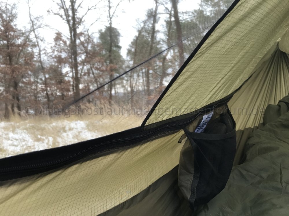 Die Innentasche am Einstieg finde ich ziemlich nutzlos, weil sich der Stoff dort zu stark bewegt, und ohne Gewicht in der Hängematte zu sehr herumschlackert. Abgesehen davon kollidiert das Knie damit, wenn man es anzieht. Ich würde diese Tasche ganz weg lassen.