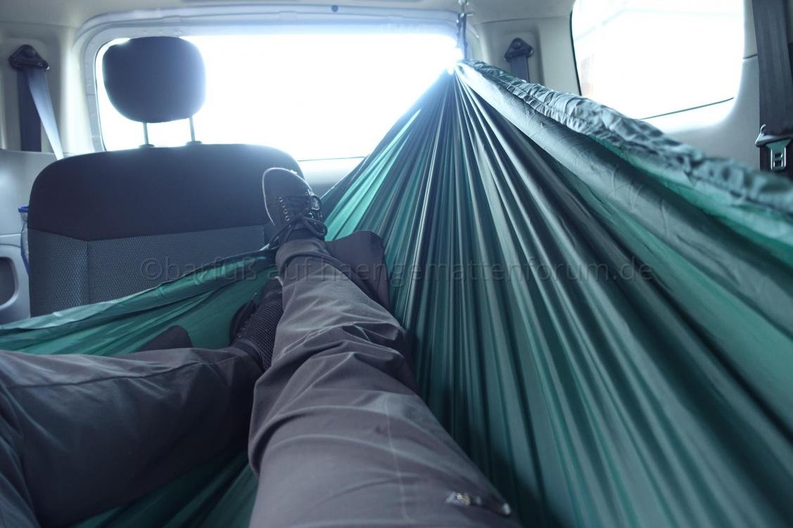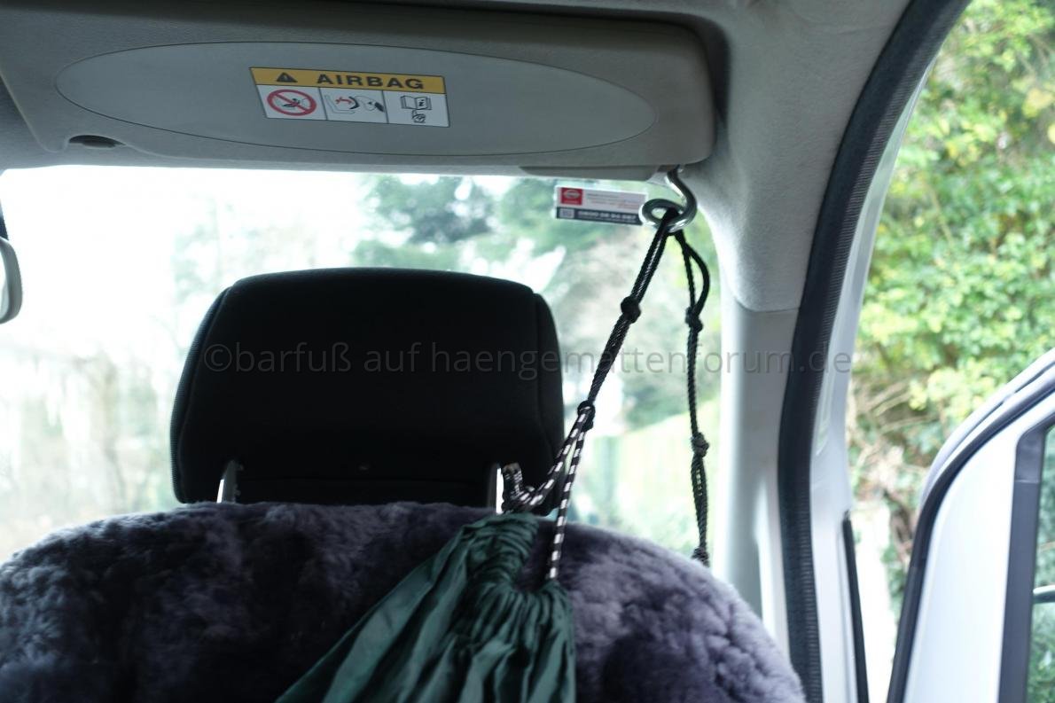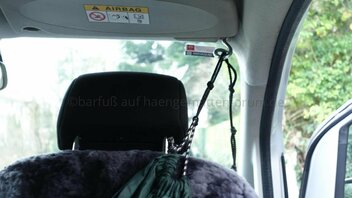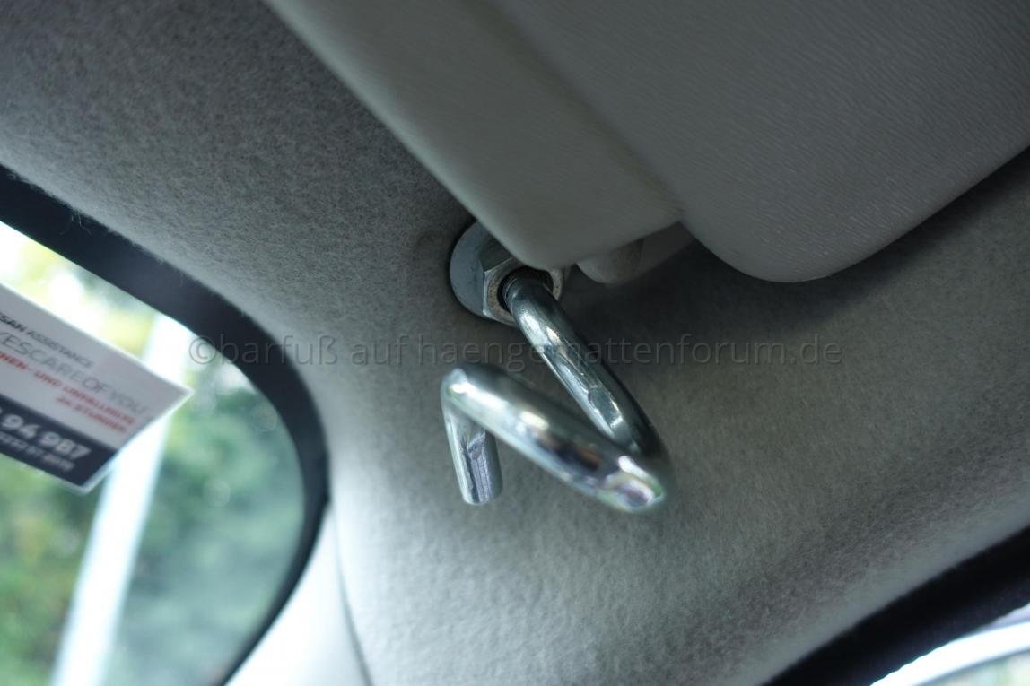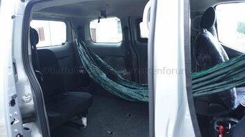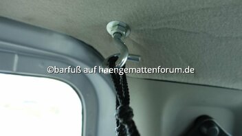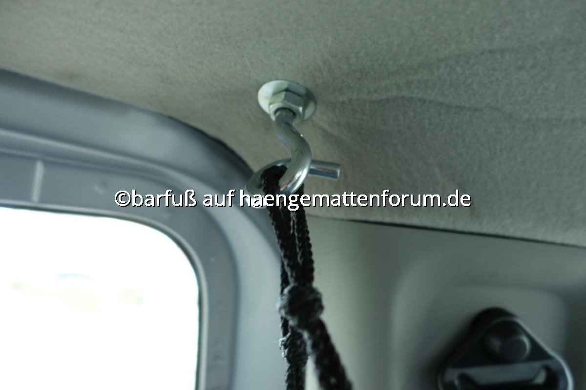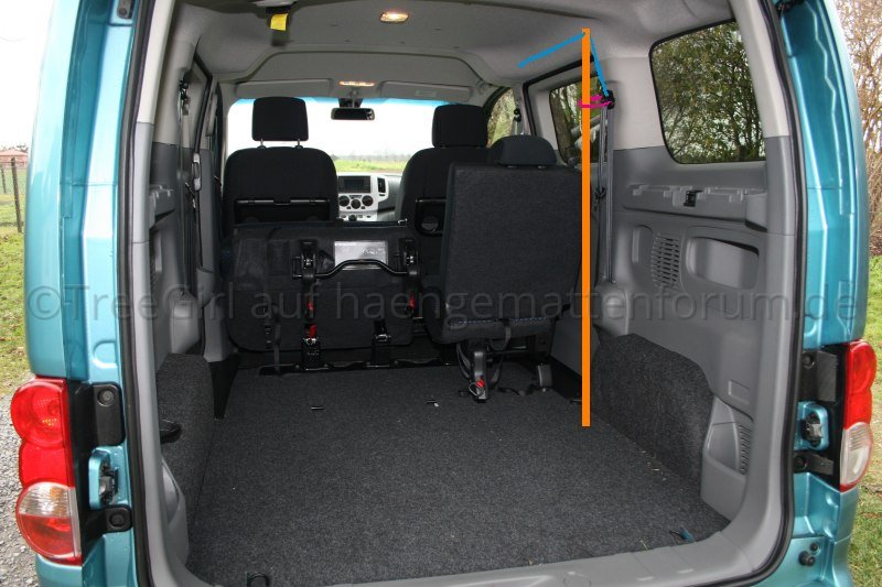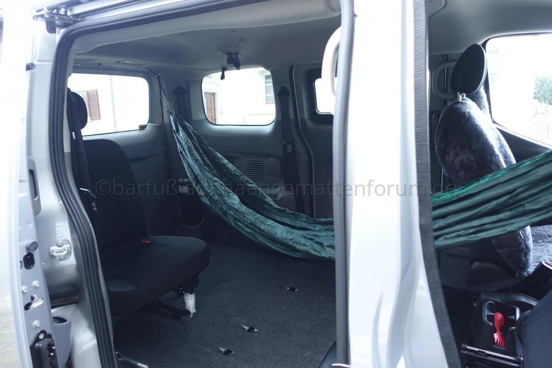 Nachdem ich mir inzwischen einen NIssan NV200 Evalia gekauft habe (das schmalste (1,69m) und kürzeste (4,40m) Auto, das gerade noch die Länge hat, um eine Hängematte im Innern aufzuhängen), stehe ich vor dem Problem, wie ich die HM befestige.
