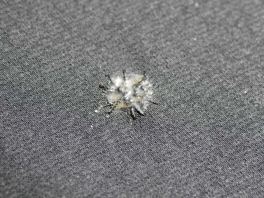 Hab noch mal ein Bild gemacht, um die Reparatur zu veranschaulichen. In etwa zehnfacher Vergrößerung sieht die reparierte Stelle etwas martialisch aus, aber sie fällt auf der schwarzen Jacke in natura fast nicht auf. Das Positive daran: Seam Grip ist extrem dehnbar, d.h. an dieser Stelle reißt garantiert nichts ein oder franst aus. Die Jacke wurde seitdem auch schon mehrmals gewaschen, ohne dass die Reparatur dadurch irgendwelchen Schaden nahm.