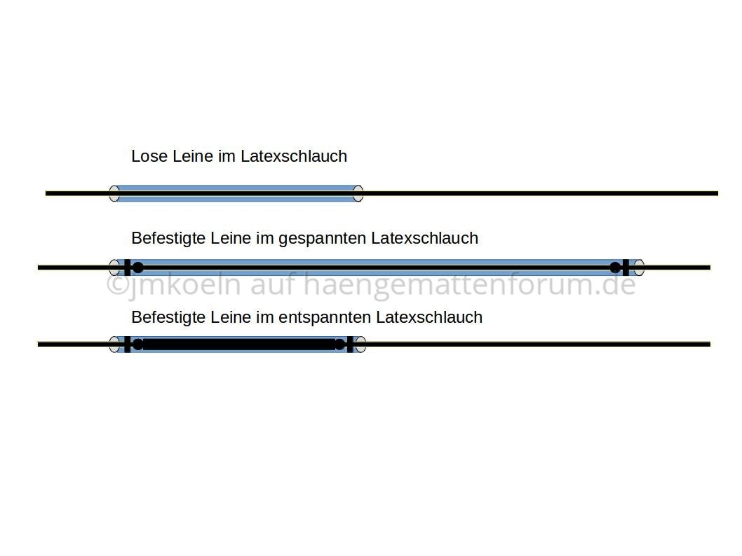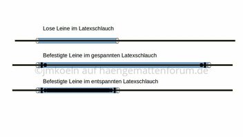 Also die Abspannleine durch den Latexschlauch ziehen, unten einen Knoten rein, den Knoten in den Schlauch ziehen und mit einem Faden fixieren.