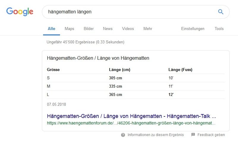 Wenn ich die beiden Terme google, bekomme ich unter den ersten fünf Ergebnissen nur Links zu Online-Shops – und auch nicht die schöne Tabelle, sondern nur Textinfos. Ach, Google